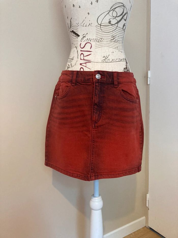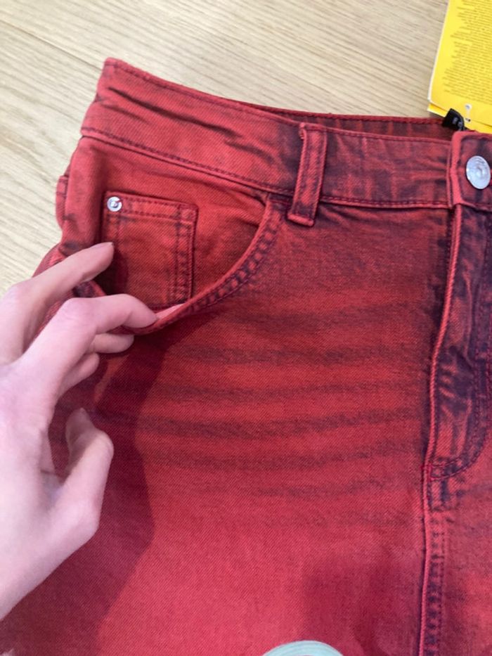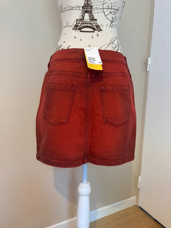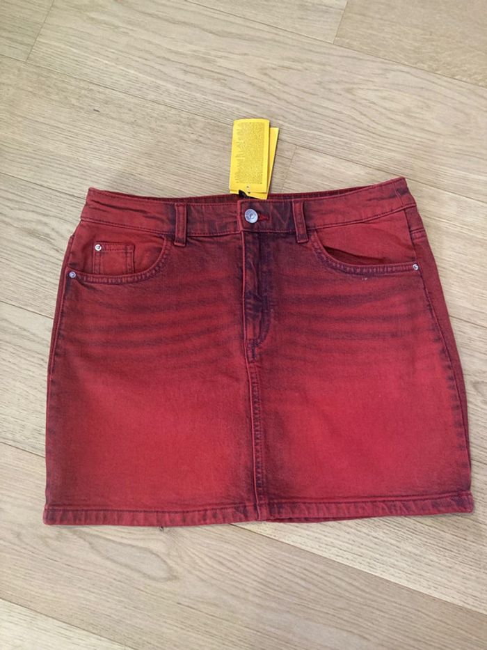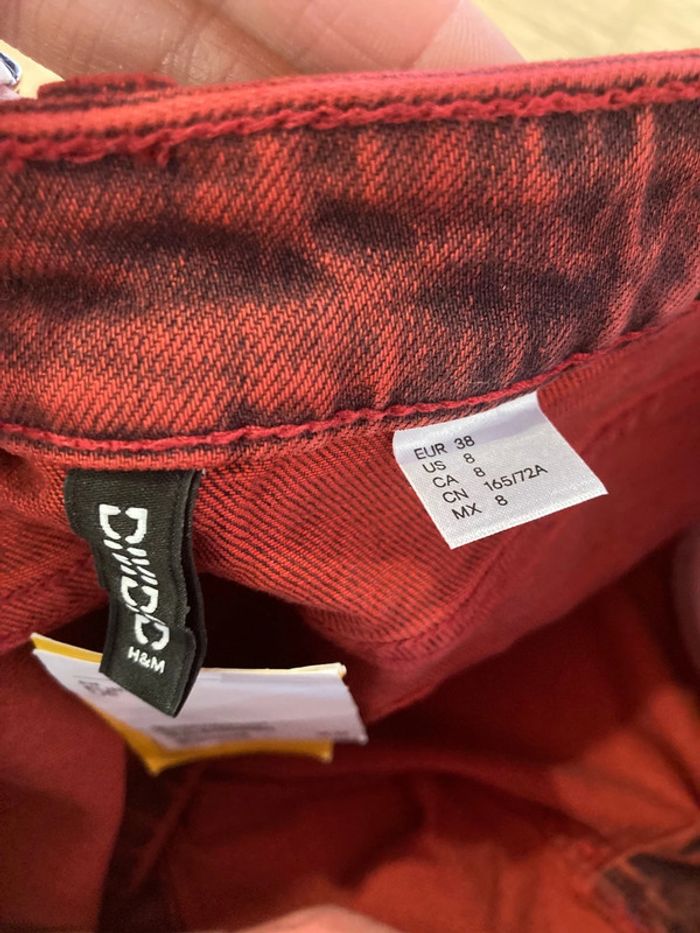 Neuve jamais portée avec étiquette d’achat Mini jupe en jean Divided H&M En denim rouge Taille 38 Fermeture éclair et bouton 2 vraies poches devant et 2 à l’arrière Valeur 29,99 Hauteur 37 cm