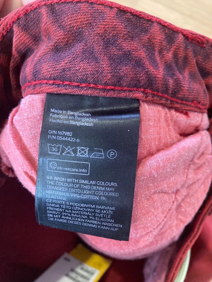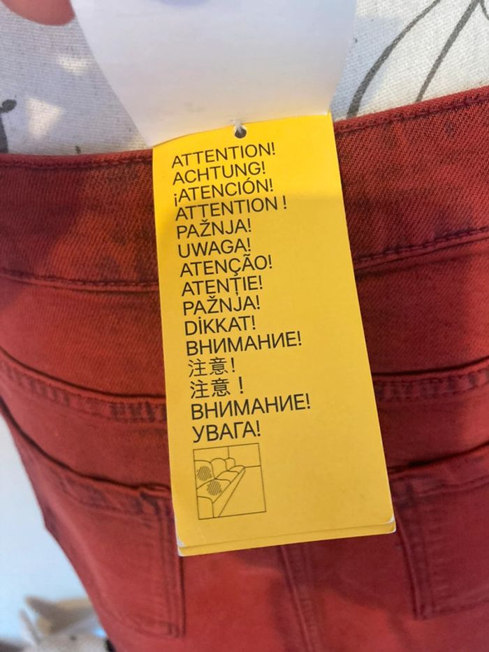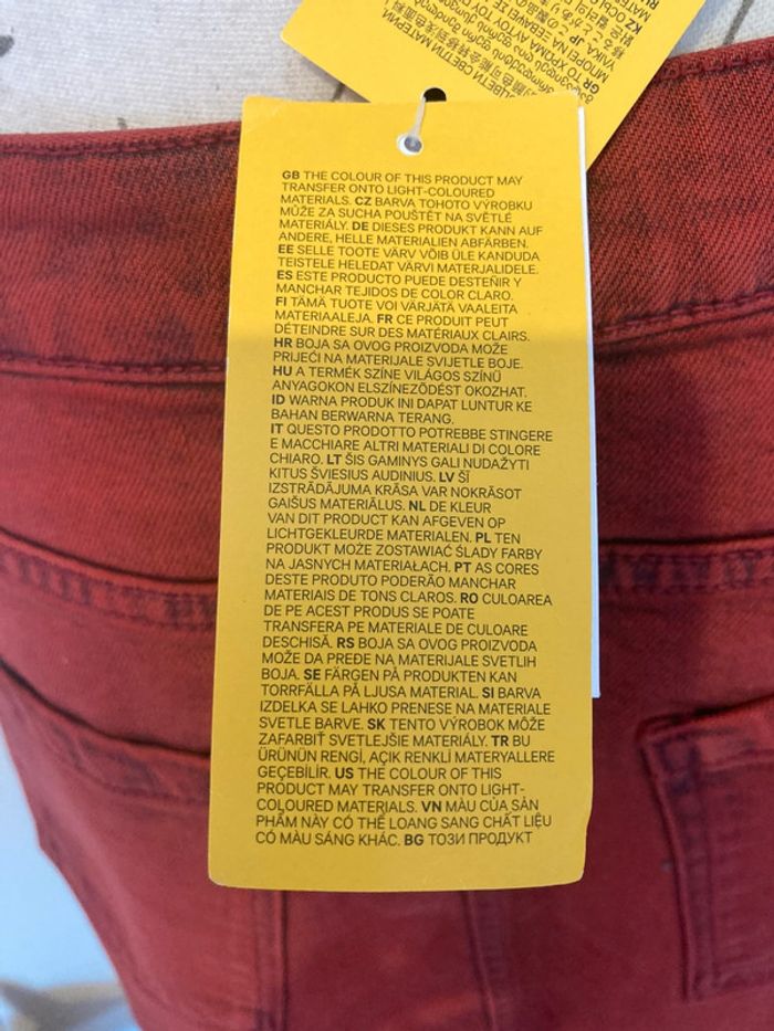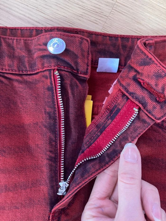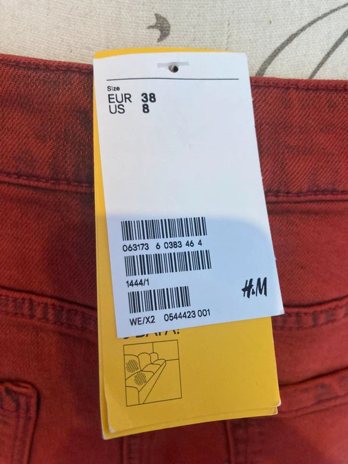 Neuve jamais portée avec étiquette d’achat Mini jupe en jean Divided H&M En denim rouge Taille 38 Fermeture éclair et bouton 2 vraies poches devant et 2 à l’arrière Valeur 29,99 Hauteur 37 cm