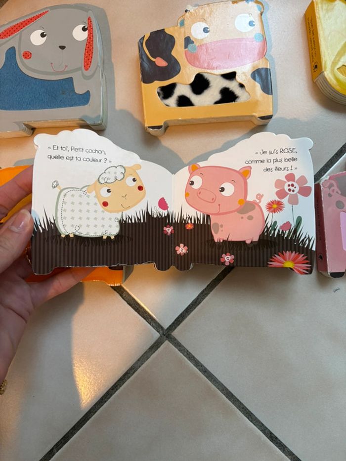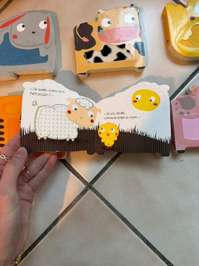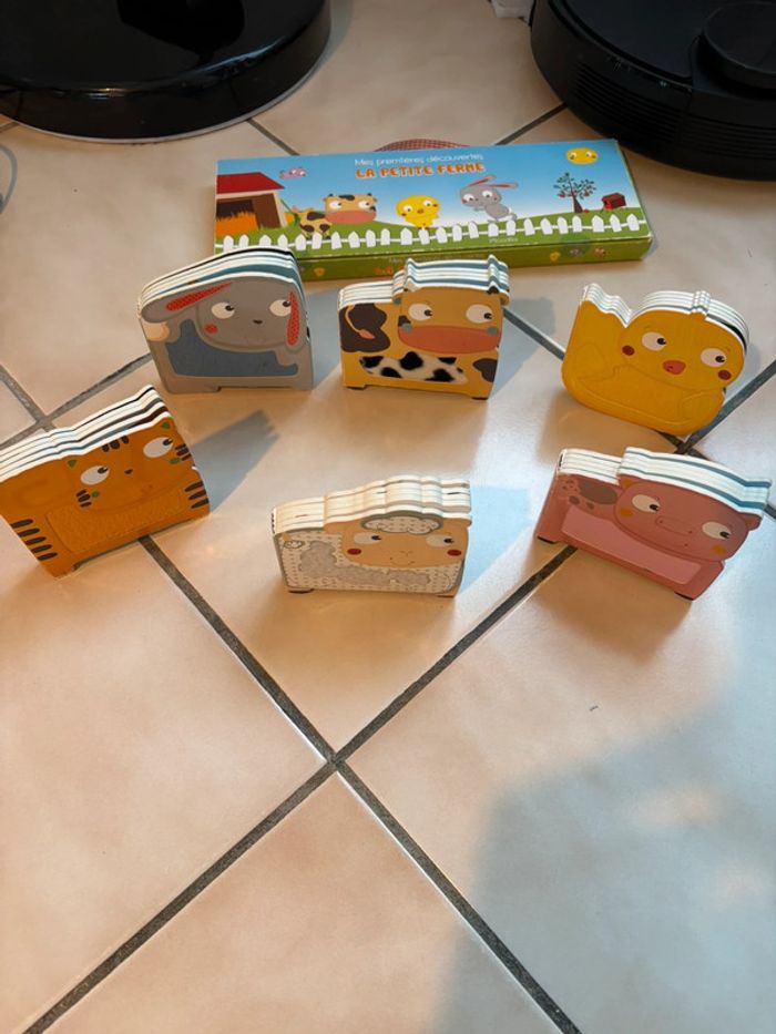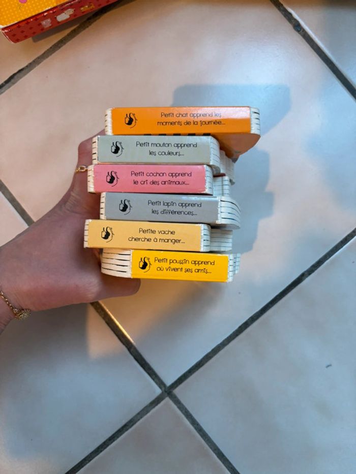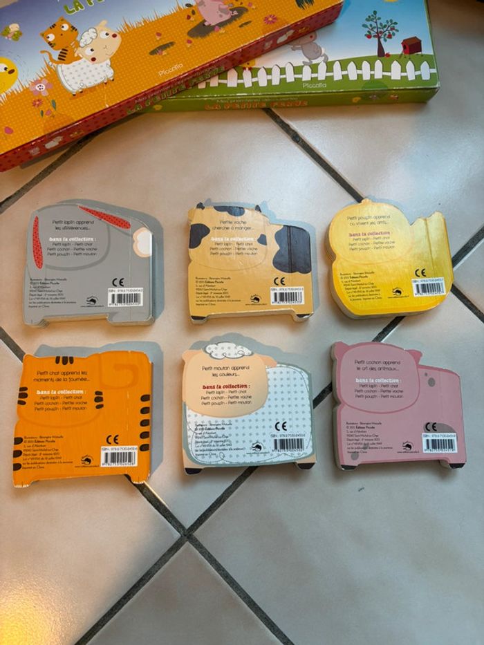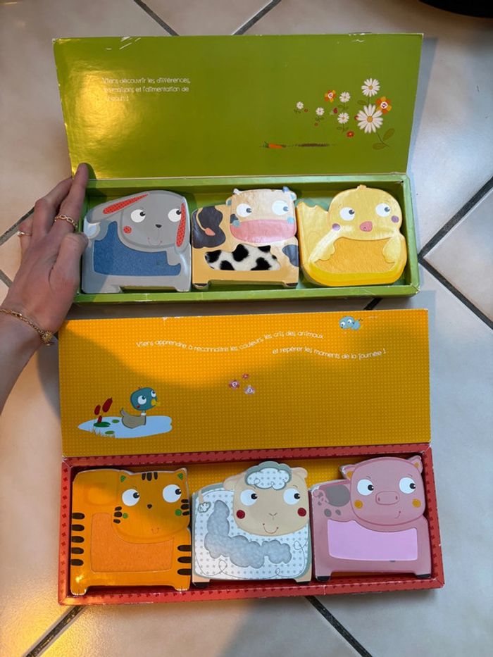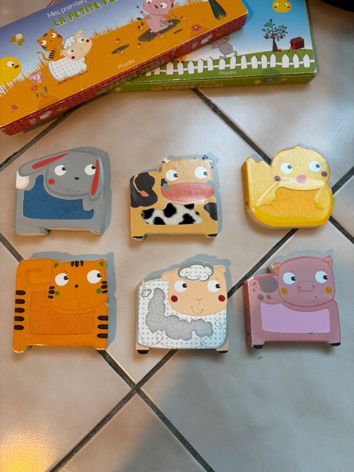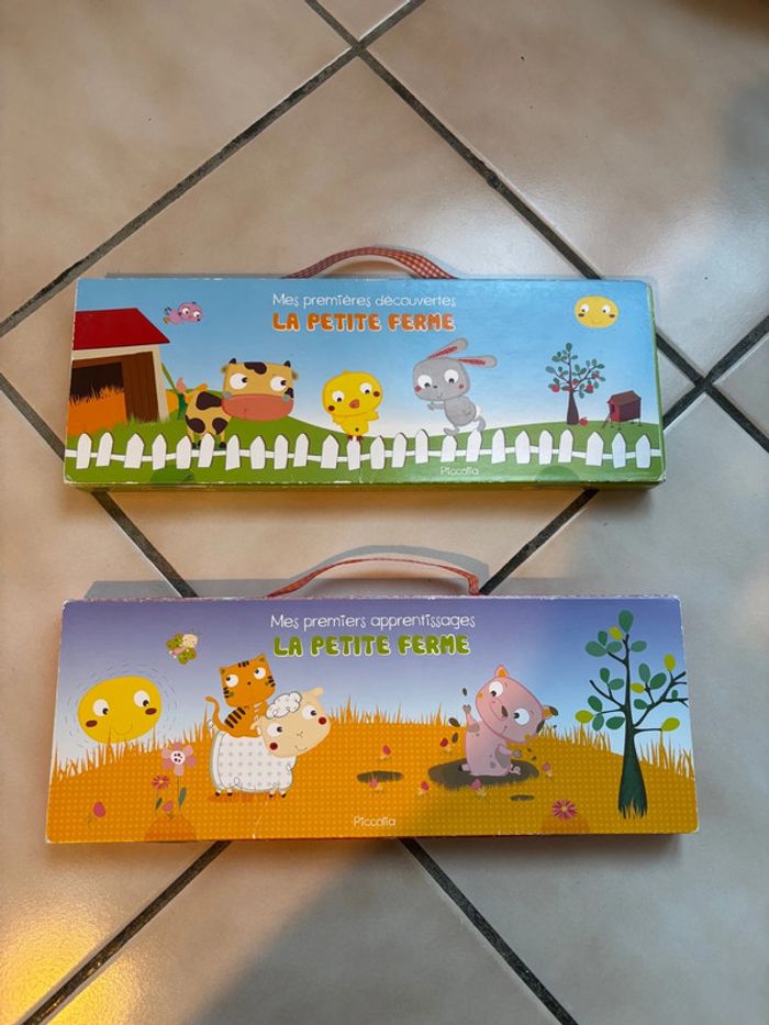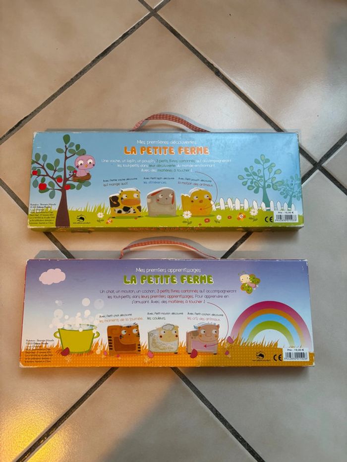 En bon état général 2 valisettes de mini livres Piccolia La petite ferme Avec matières à toucher Les livres tiennent debout Livres cartonnés pour bébé