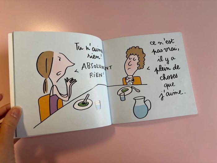Lu plusieurs fois en bon état Le livre des j’aime De Soledad Bravi et Hervé Eparvier École des loisirs J'aime, j'aime, j'aime ! Ce n'est pas parce que les enfants n'aiment pas les épinards qu'ils n'aiment rien ! Il y a beaucoup de choses qu'ils aiment faire comme : aller chercher du pain habillé en superman, ou sauter dans les flaques d'eau !
