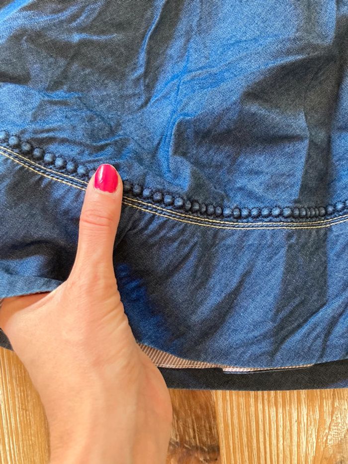 Portée une seule fois en très bon état Jupe courte patineuse Camaïeu Taille 38 Effet denim Petites boules dans la base tout le tour pour tenir la jupe pour ne pas qu’elle s’envole ☺️ voir photo 4 Fermeture éclair au dos Longueur 40/41 cm Pas repassée désolée ☺️
