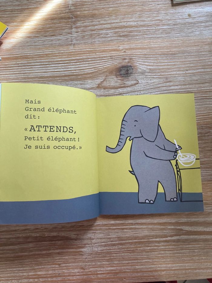 En bon état Livre école des loisirs Titoumax Attend petit éléphant! 3-6 ans Valeur 12€ Grand éléphant appelle Petit éléphant pour manger. Mais Petit éléphant a bien mieux à faire : jouer, lire, travailler… « Ce n’est pas grave, dit Grand éléphant, nous mangerons ton goûter ! » Alors là, Petit éléphant court très, très vite. Parce que l’heure du goûter, c’est l’heure du goûter !