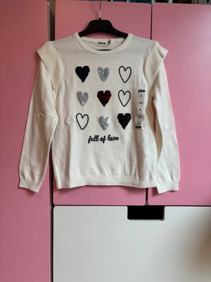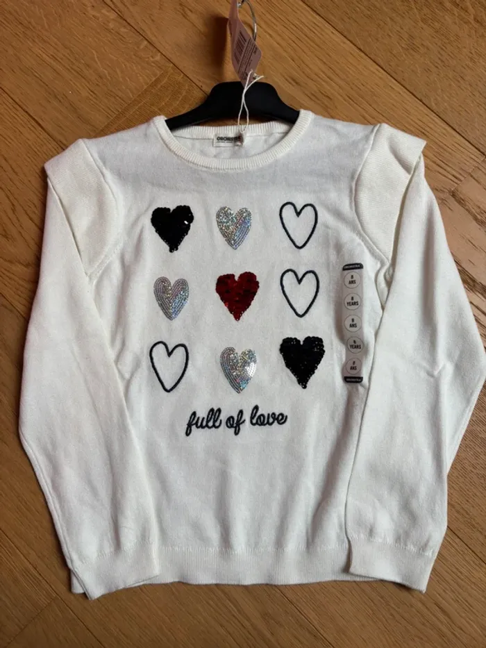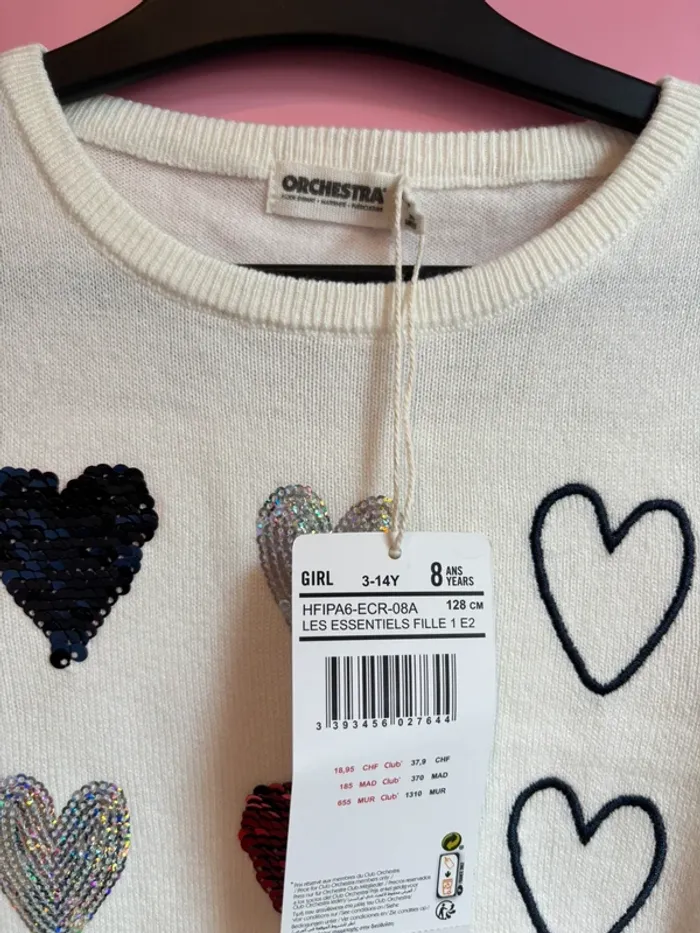 Neuf jamais porté avec étiquette d’achat Pull cœurs à sequins réversibles rouge et bleu Marque Orchestra Taille 8 ans Couleur blanc écru