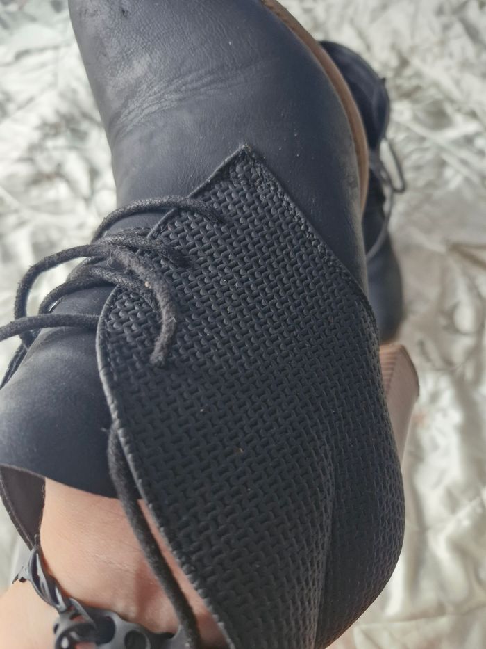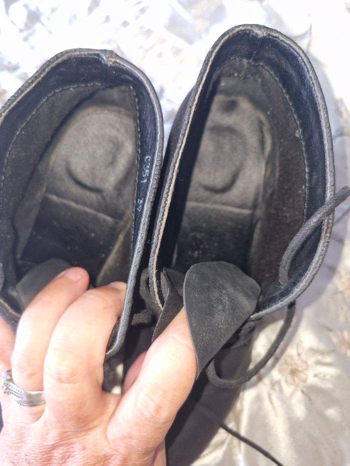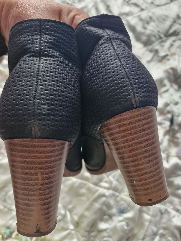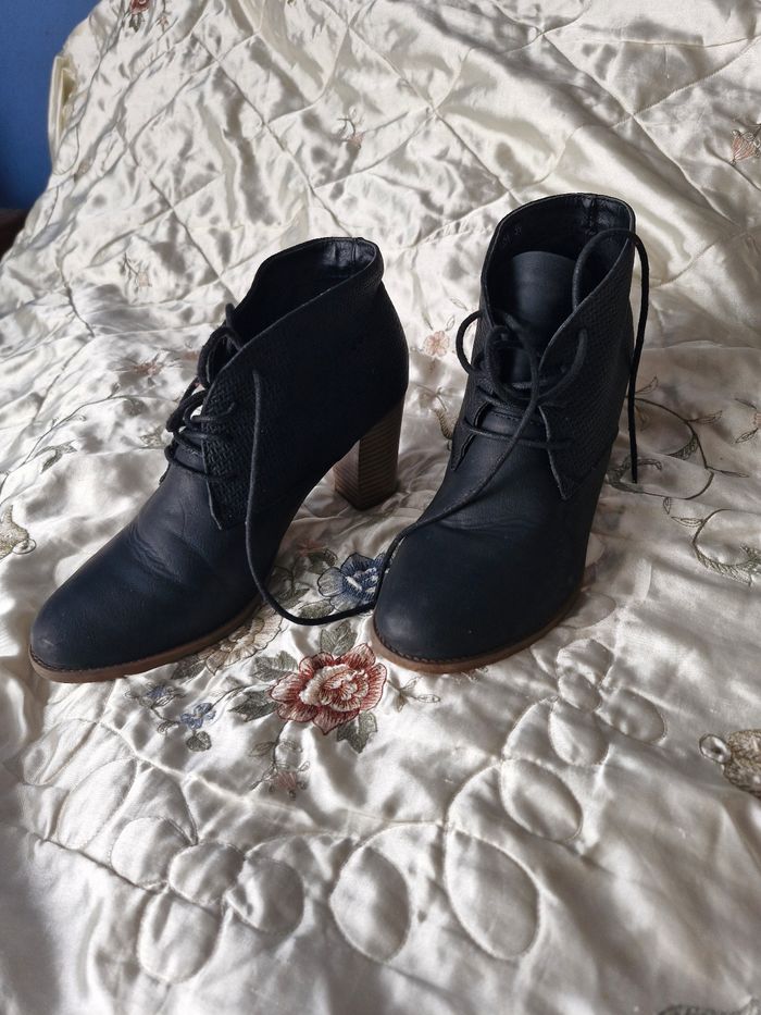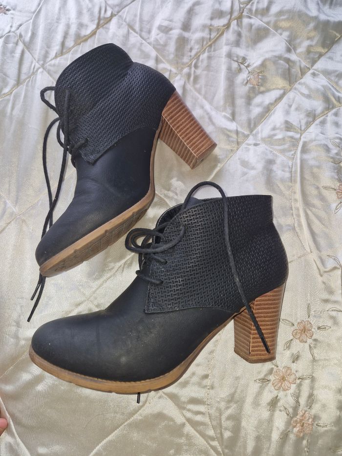 Superbes bottines Cuir souple Stylée par un effet nid d'abeille Fermeture par lacets devant Talon effet bois de 7cms Quelques traces d'usures à voir sur les photos Un accroc sur le côté Un talon a été cloué Usure de frottement sur l'arrière N'hésitez pas à créer un lot pour profiter des réductions actives dès 2 articles #naya59199chaussurefemme #naya59199chaussure #naya59199chaussurep39