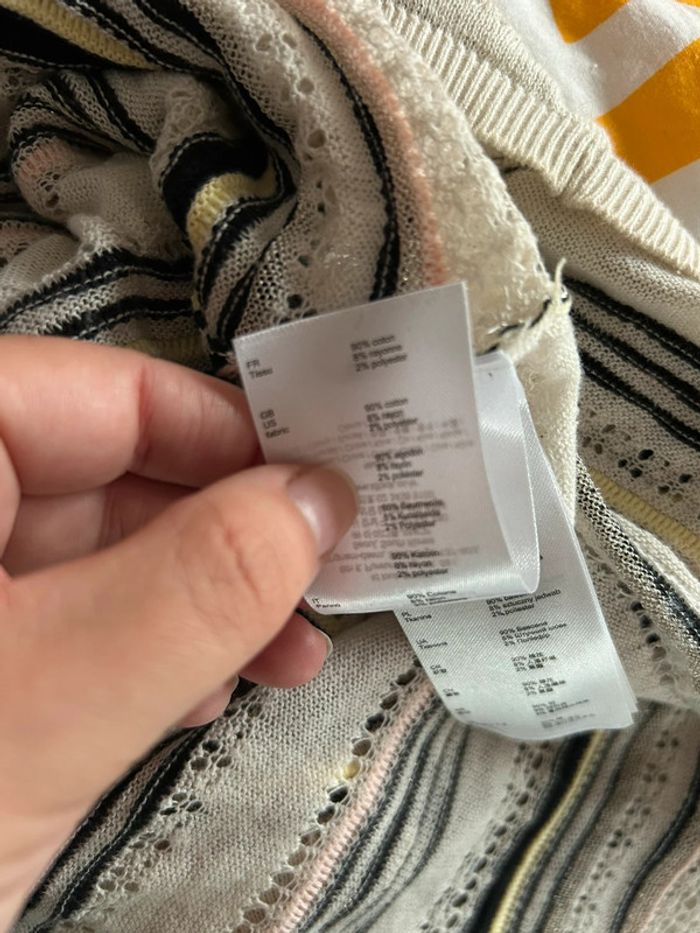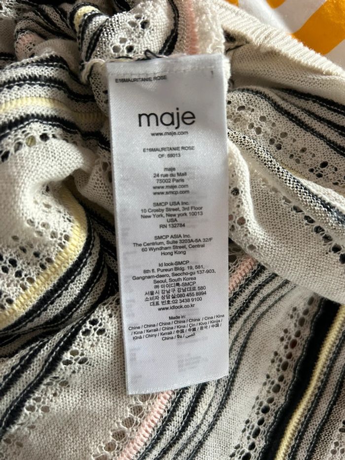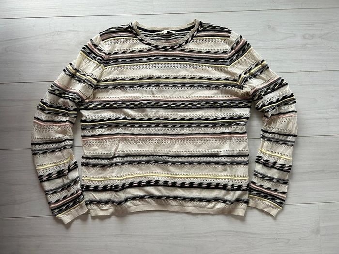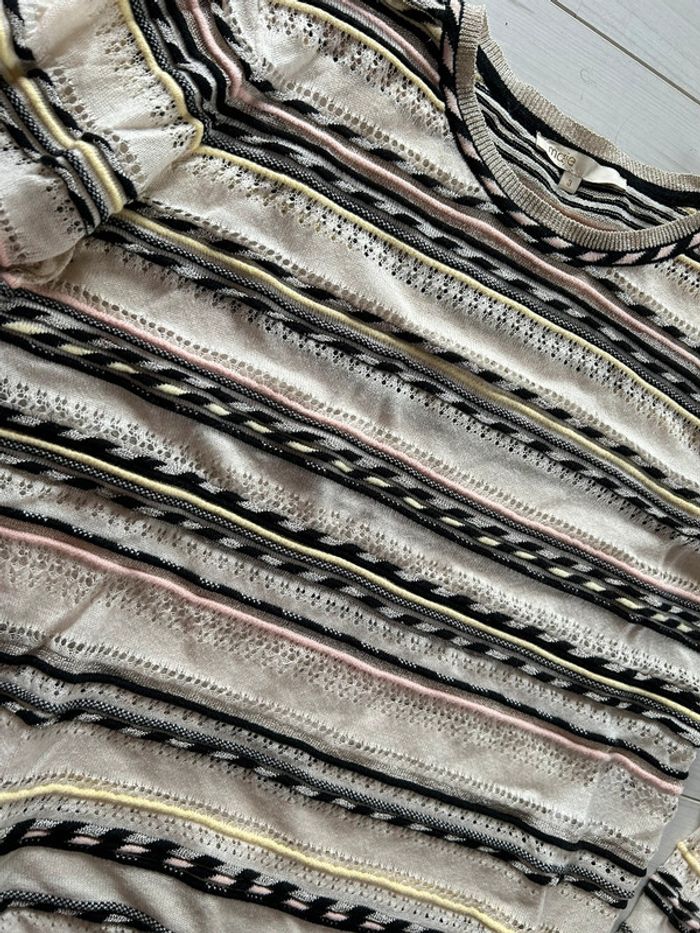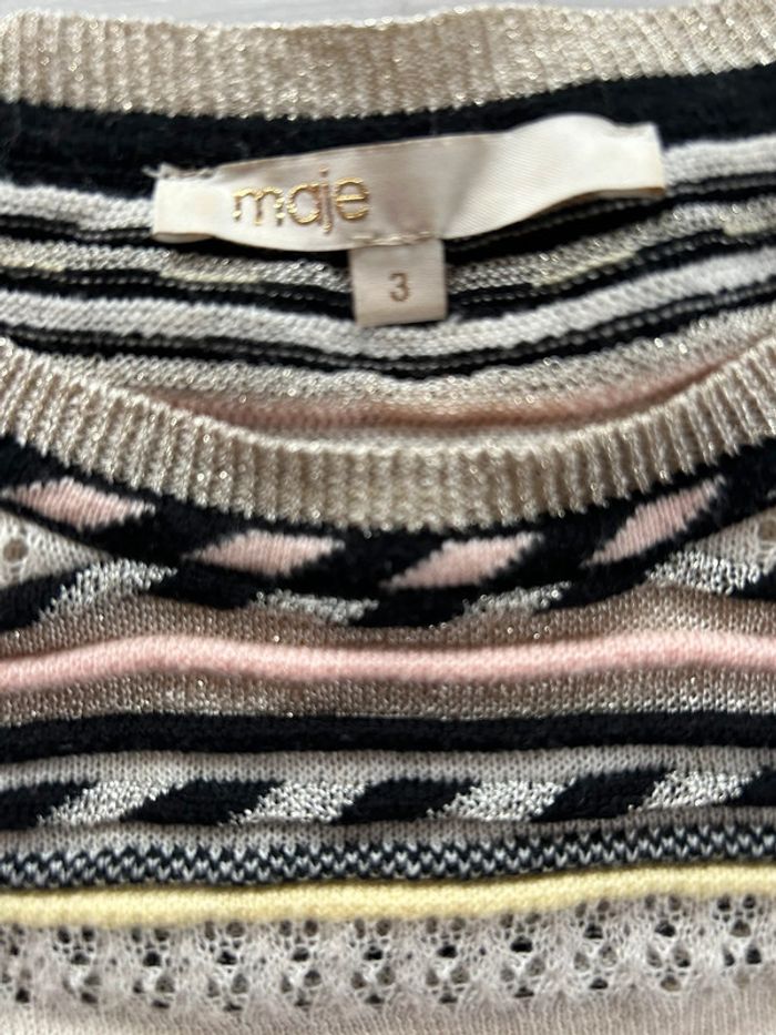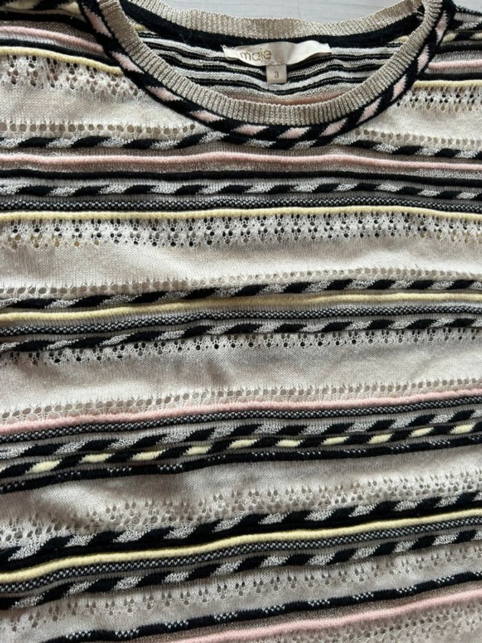 Pull en coton Maje Taille 3 Maille fine, ajourée à certains endroits Couleur écru , avec rayures noir / argenté , jaune et rose Référence : Mauritanie En parfait état Vu dans les séries télé (pretty little liars etc) #maje #majeaddict #prettylittleliars