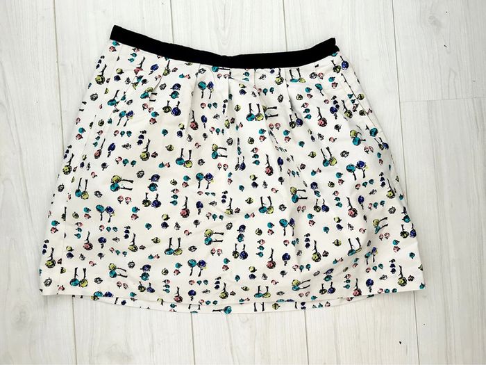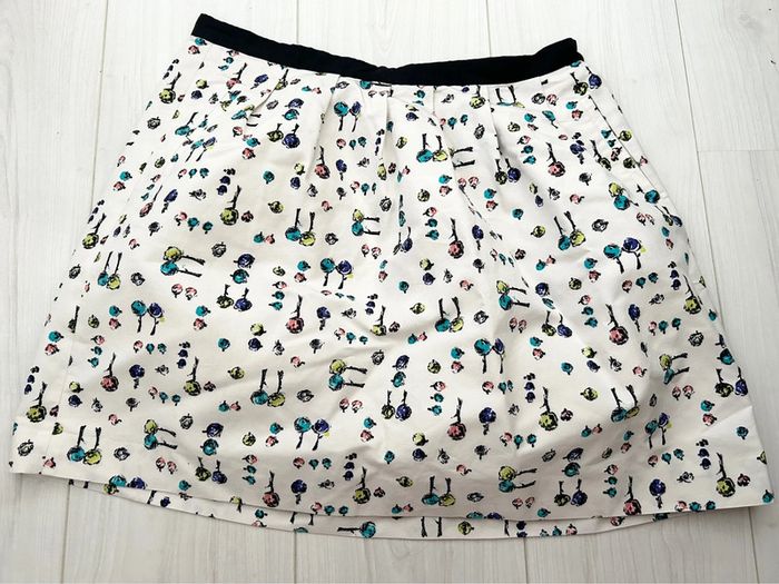 Jupe courte Claudie Pierlot Taille 40 Fermeture par zip et bouton pression Doublure Jupe en coton et soie Imprimé multicolore bleu marine rite quoi rose vert sur fond blanc. En parfait état #claudiepierlot #sandro #maje #jupefemme