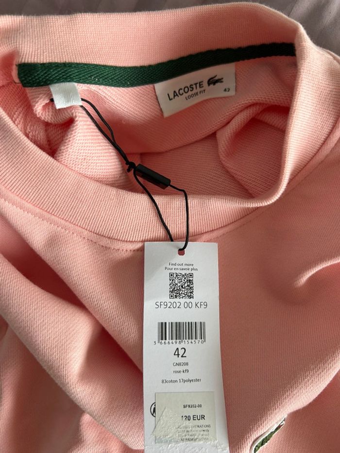 Sweat shirt Lacoste Taille 42 Coupe loose fit Couleur rose Neuf avec étiquette Coton bio