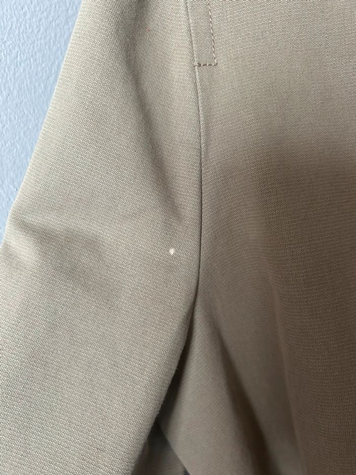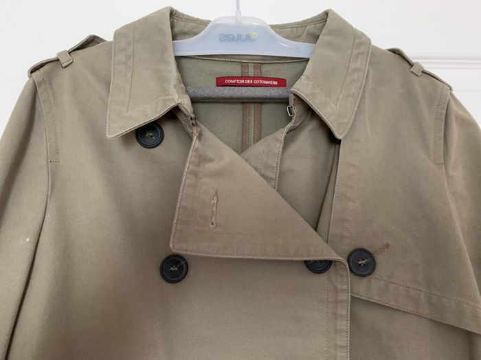 Veste saharienne Comptoir des Cotonniers Taille 42 Modèle Clock coloris beige / kaki manches 3/4 Très peu portée, a été lavée au pressing. en parfait état. Une petite tache décolorée a signaler (visible sur les photos) #comptoirdescotonniers #saharienne #sable #coton #ceinture