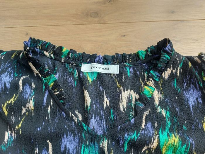 Blouse femme Promod Tissus touché crepe. Bas légèrement évasé (peplum) Manches légèrement ballons. Taille 36 Très bon état. Polyester et elasthanne