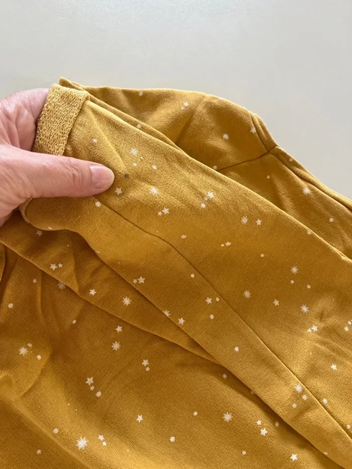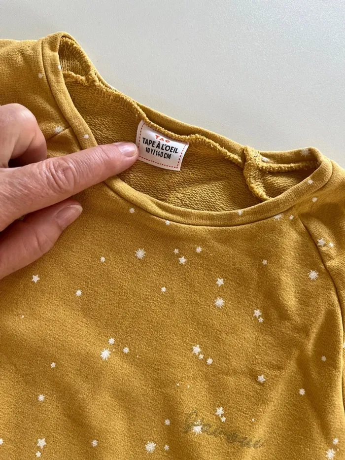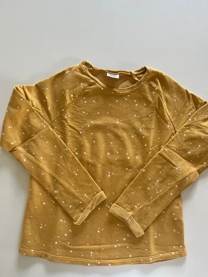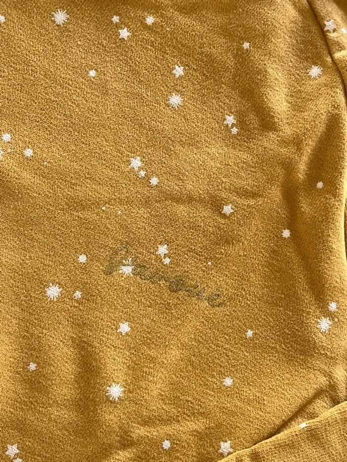 En excellent état ( petite tache derrière une manche mais ne se voit pas sweat porté, voir dernière photo) Jaune moutarde avec étoiles écru