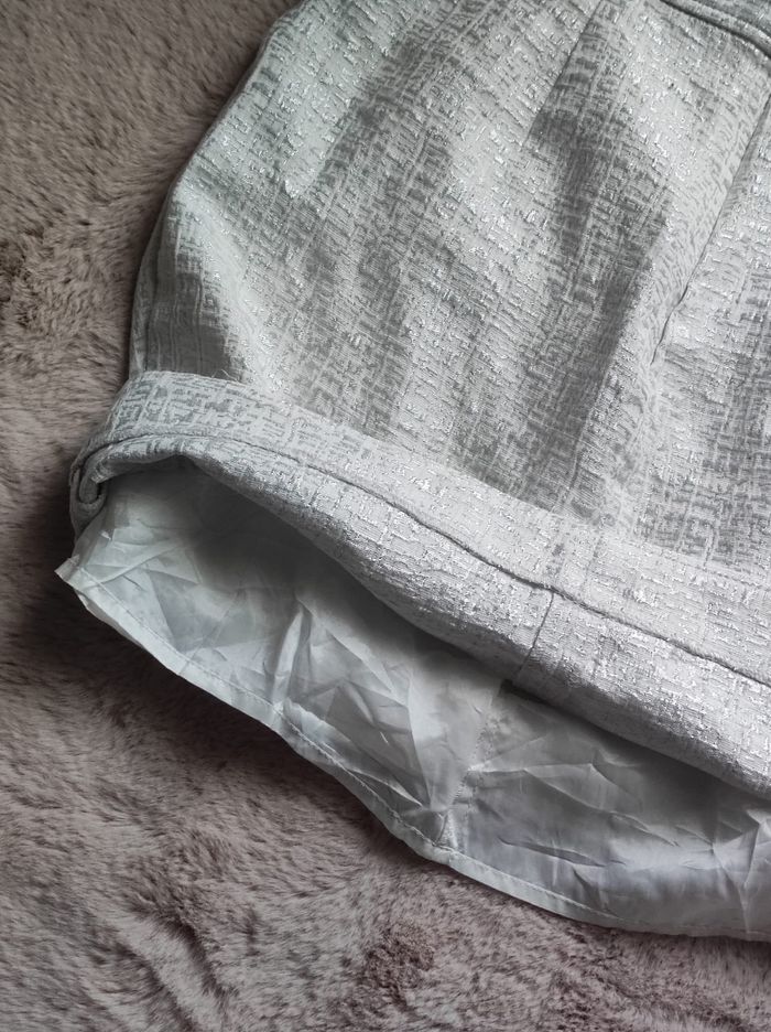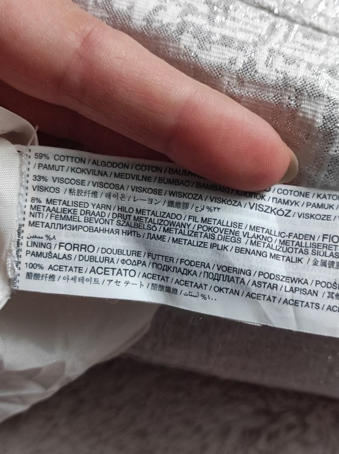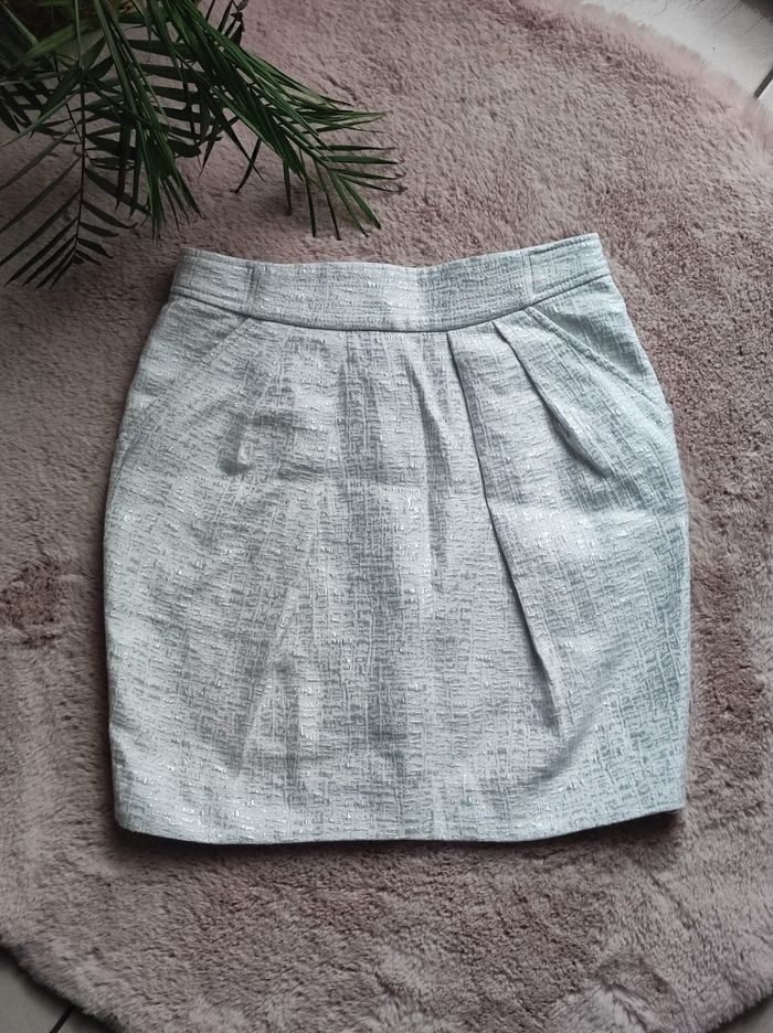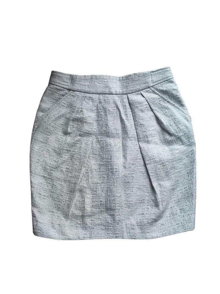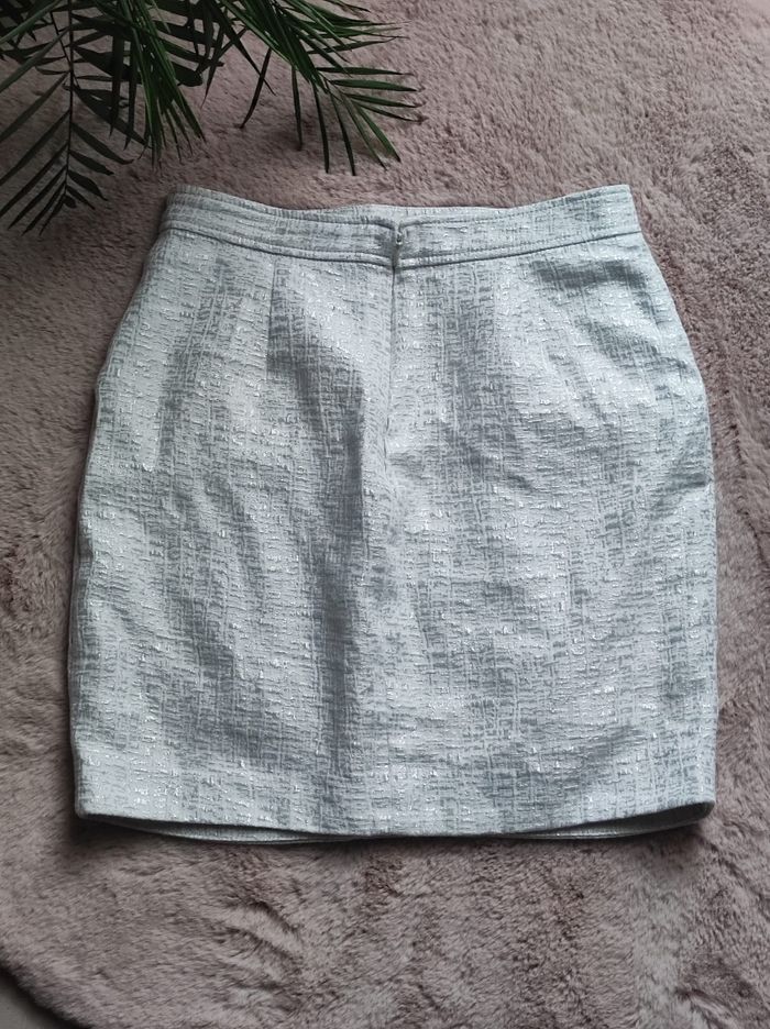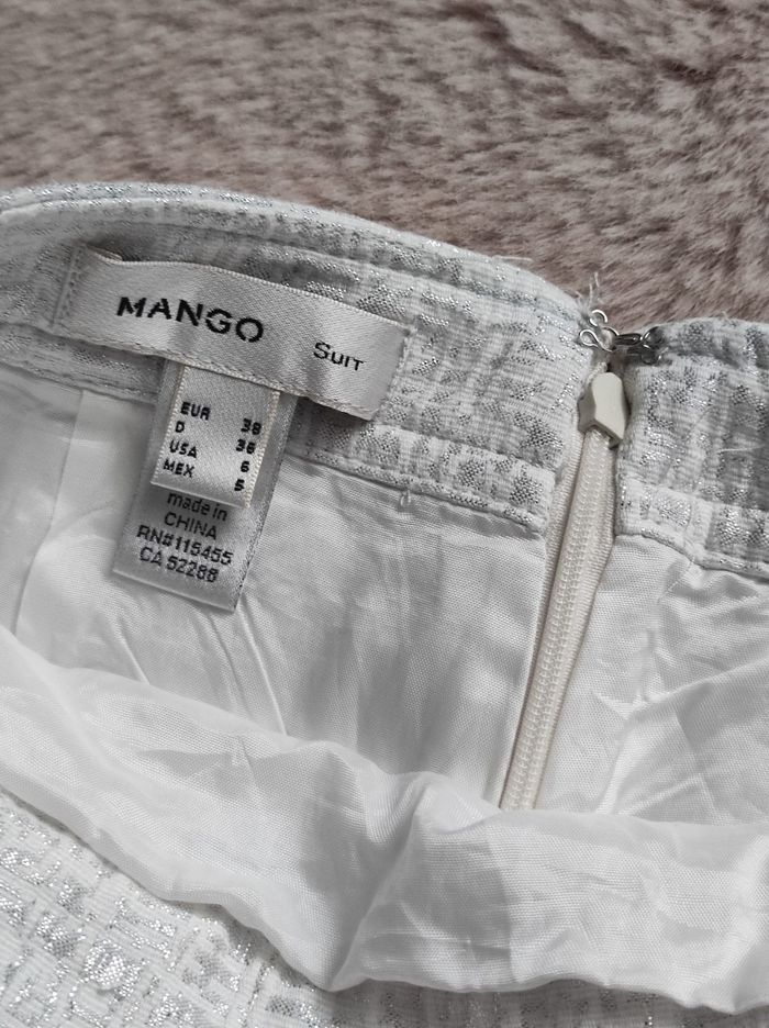 petite jupe courte de couleur blanche avec brillant ( effet métallisé ), deux poches sur le côté. Fermeture éclair arrière avec petit crochet. Doublé intérieurement. 59% coton, 33% viscose et 8% fils métallisé. Marque mango en taille 38. En parfait état, ni trou tâches ou déchirures.