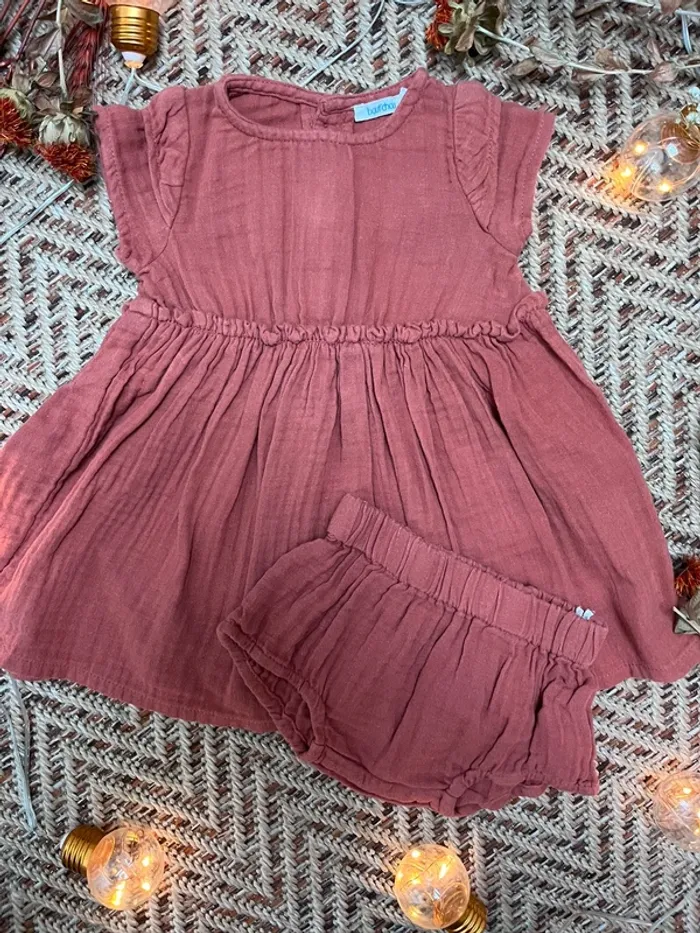 Ensemble robe et culotte / bloomer en gaze de coton Couleur terracotta Bout’chou 3 mois Très bon état 🐣 Envoi rapide et soigné - Plein d’autres vêtements bébé - Réductions sur les lots 🐣 Dressing trié par tailles dans à propos #JJleMac_3mois