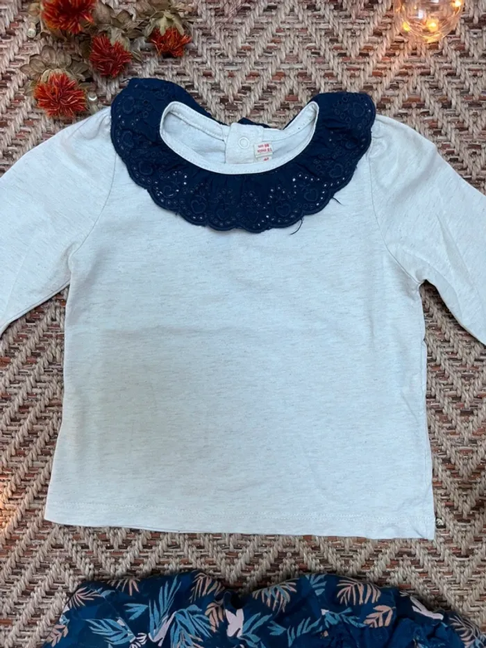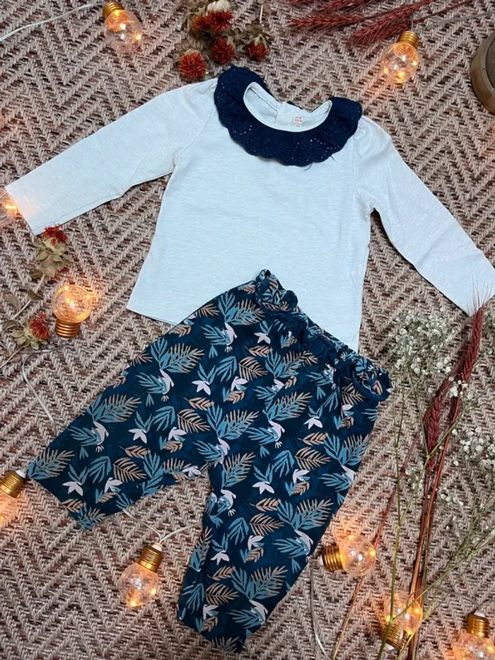 Tenue composée de : - un t-shirt manches longues avec un col Claudine en dentelle, du pareil au même - un jogging fleuri Vertbaudet Très bon état 18 mois 🐣 Envoi rapide et soigné - Plein d’autres vêtements bébé - Réductions sur les lots 🐣 Dressing trié par tailles dans à propos #JJleMac_18mois
