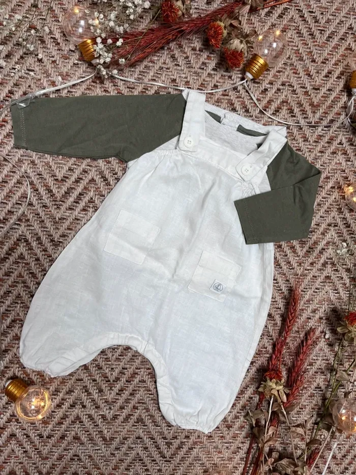 Tenue composée de : - une salopette blanche en lin, Petit Bateau - un t-shirt manches longues, Tape à l’œil 3 mois Très bon état 🐣 Envoi rapide et soigné - Plein d’autres vêtements bébé - Réductions sur les lots 🐣 Dressing trié par tailles dans à propos #JJleMac_3mois