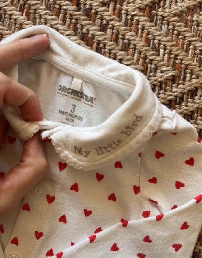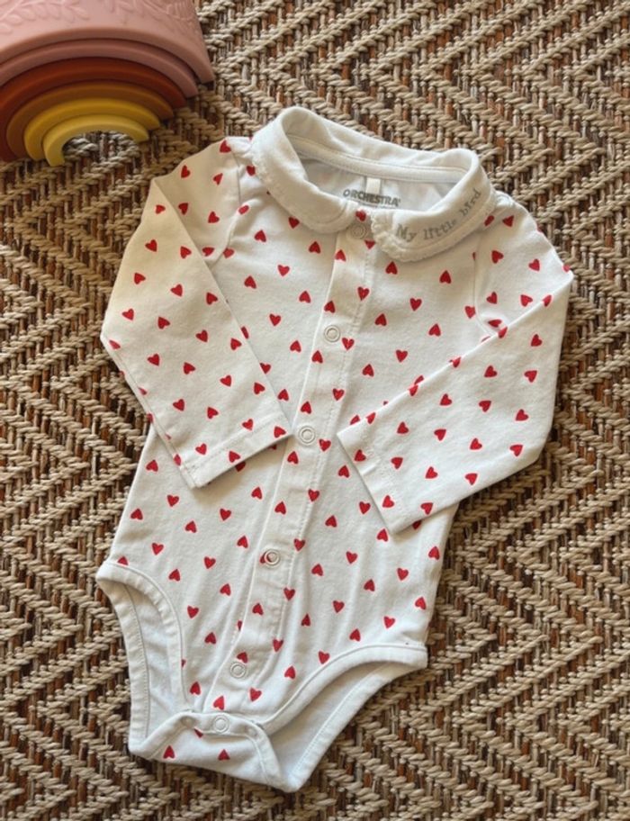 Body à manches longues, col Claudine Blanc avec des cœurs rouges Ouverture par pressions sur le devant Orchestra 3 mois Très bon état 🐣 Envoi rapide et soigné - Plein d’autres vêtements bébé - Réductions sur les lots 🐣 Dressing trié par tailles: #JJleMac_3mois