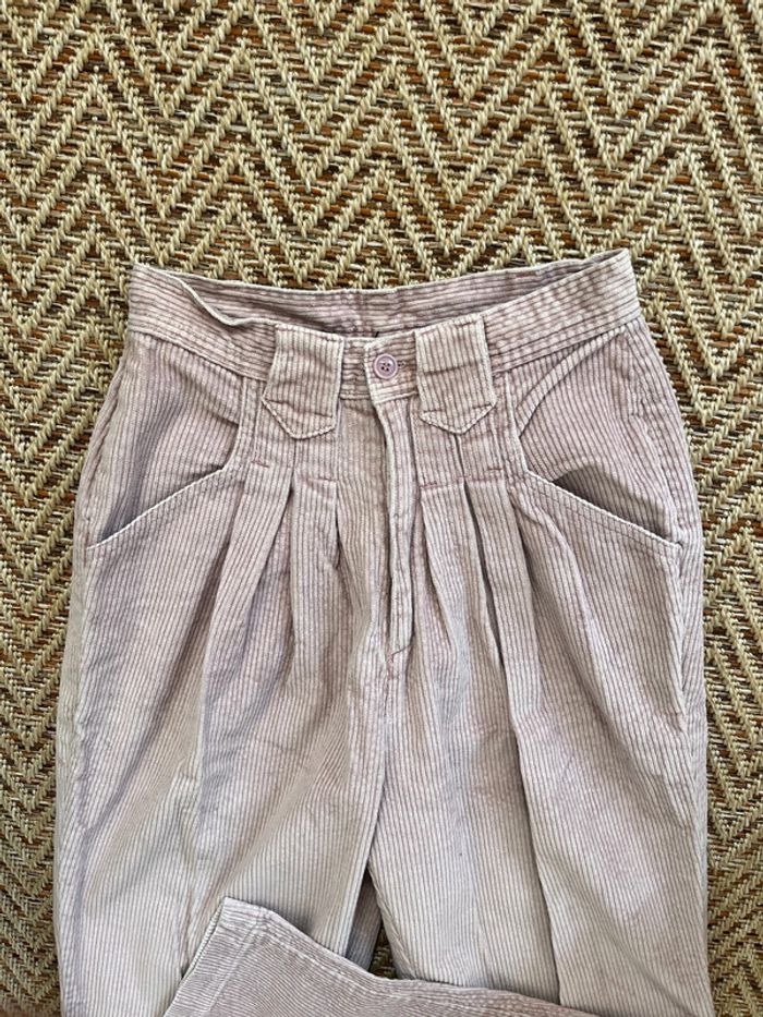 Pantalon en velours côté couleur rose clair / Lila Taille haute, jambes larges, très belle coupe Taille 32 mais les jambes sont longues. Je vous laisse regarder les dimensions car il manque l’étiquette de taille En très bon état Taille à plat : 32 cm Hanches à plat : 44 cm Longueur totale : 103 cm Longueur entrejambe : 34 cm
