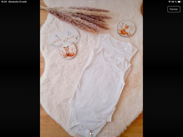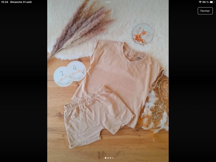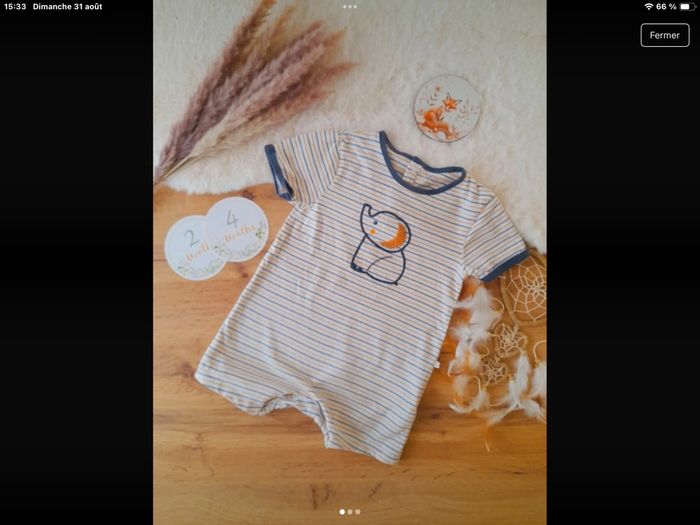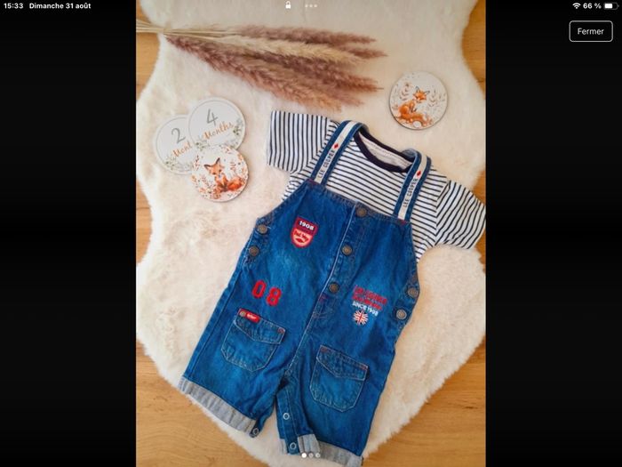 6 ensembles, 1 barboteuse 4 t-shirts manches courtes, 2 chemises manches courtes.