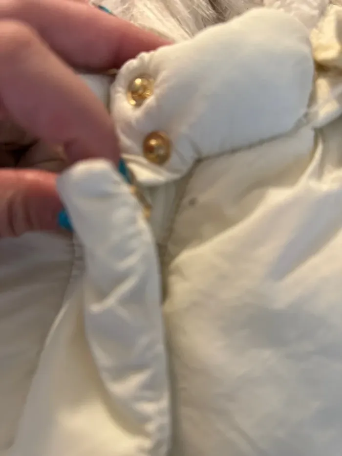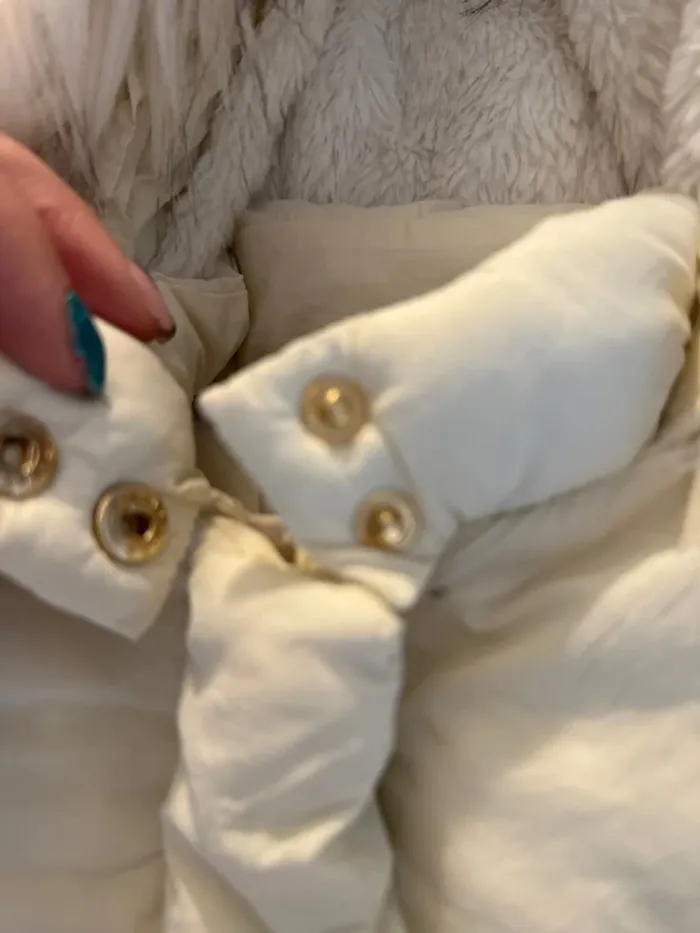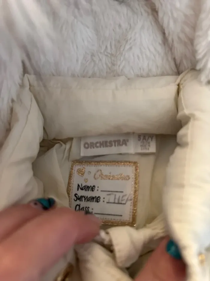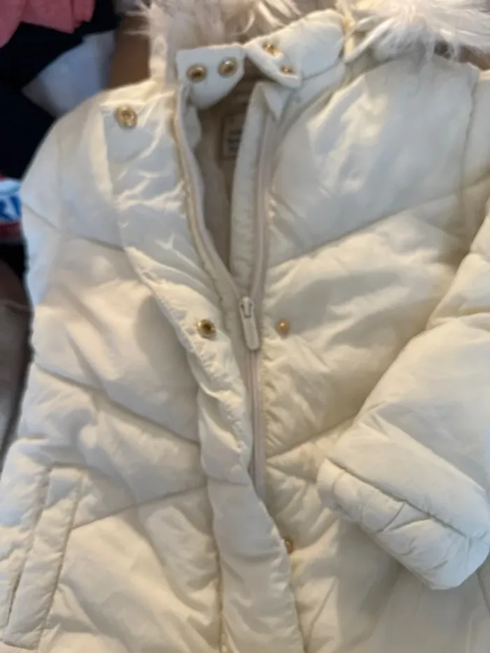 Manteau blanc à capuche détachable, capuche avec fausse fourrure, en très bon état (manque une pression en haut, voir photo, mais ça ne gêne pas la fermeture du manteau), taille 5 ans, marque orchestra #fille5ansclaiiire34