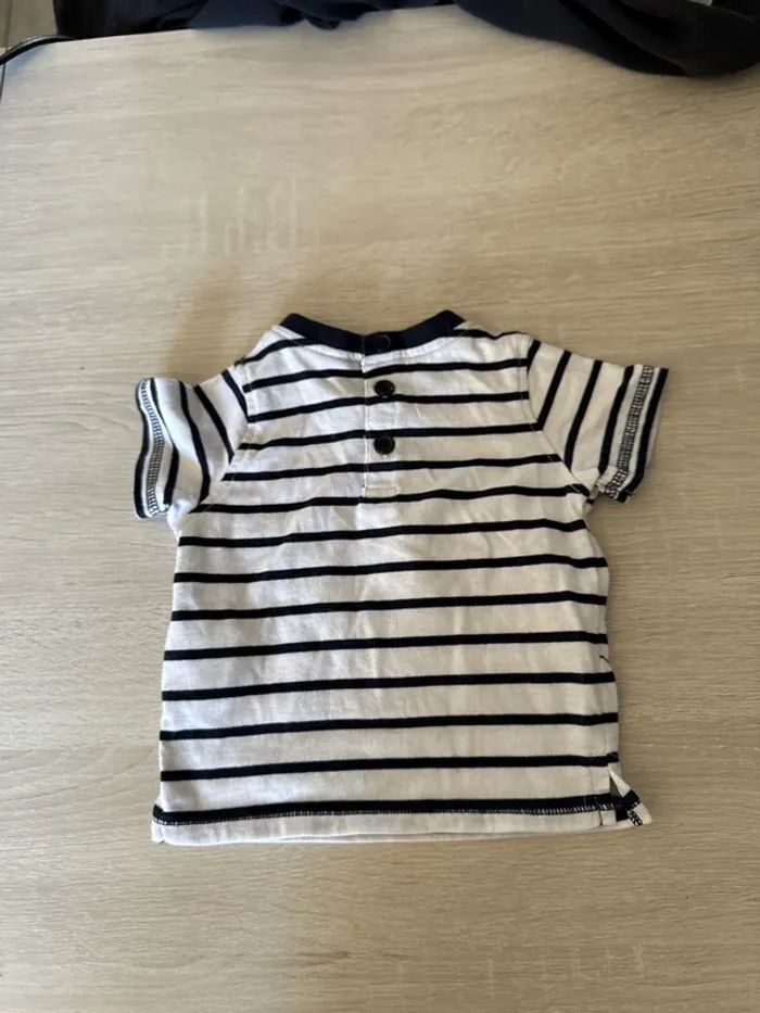 Teeshirt manches courtes, blanc à rayures bleu marine, bateau rouge devant, en très bon état, taille 3 mois #bebegarcon3moisclaiiire34