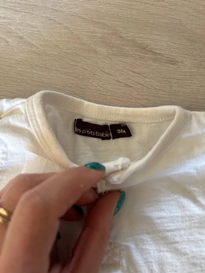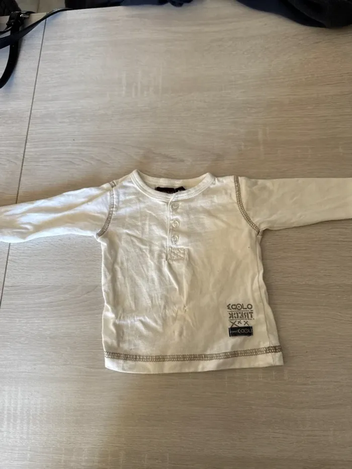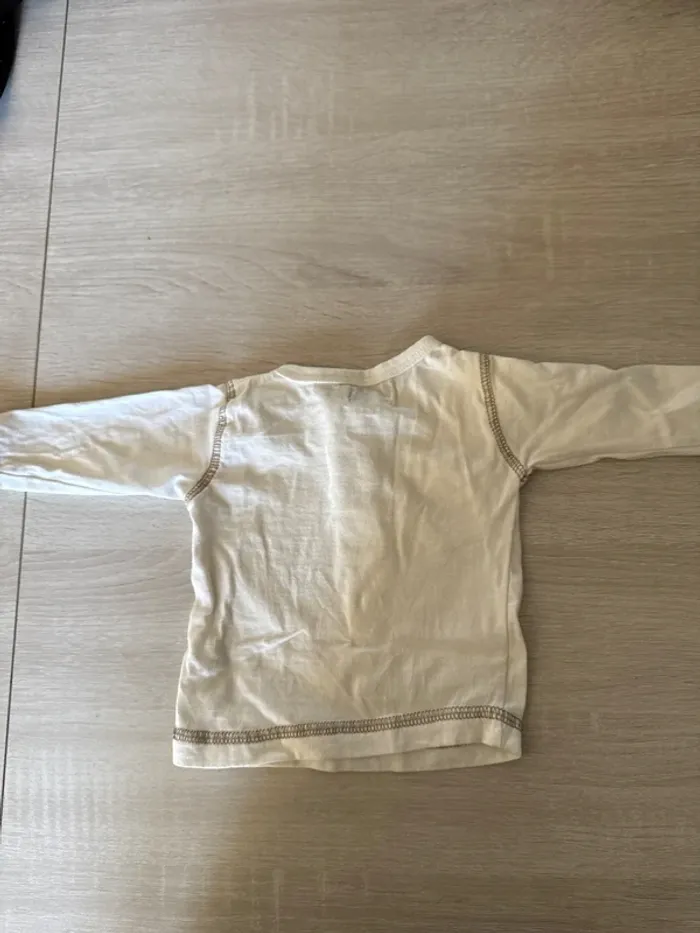 Teeshirt manches longues beige, taille 3 mois, en très bon état, marque les p’tits babies #bebegarcon3moisclaiiire34