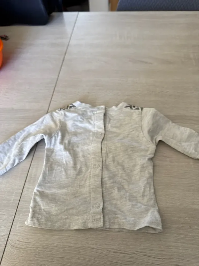 Teeshirt manches longues, gris avec écriture « mon petit explorateur » devant, marque kimbaloo, taille 1 mois, en très bon état #bebegarcon1moisclaiiire34