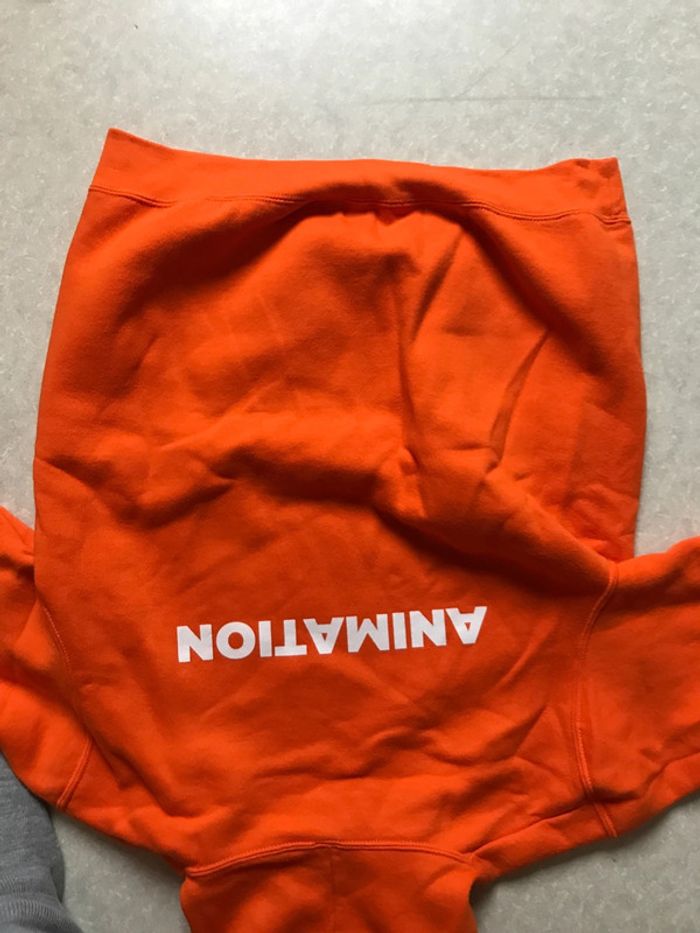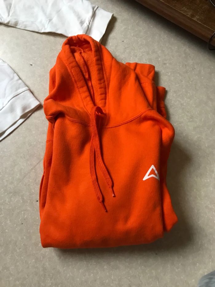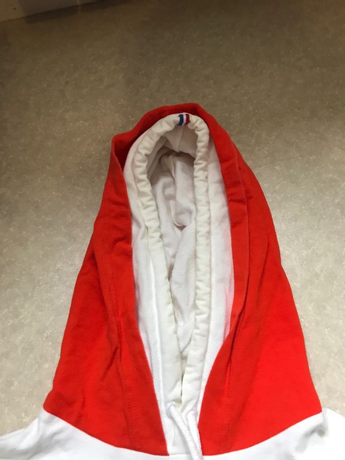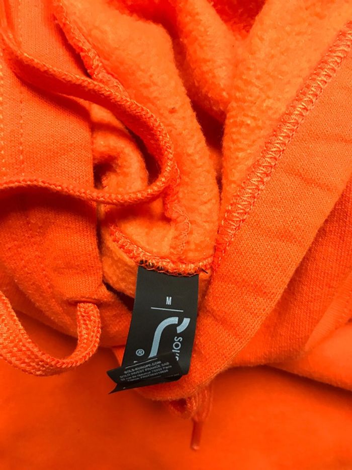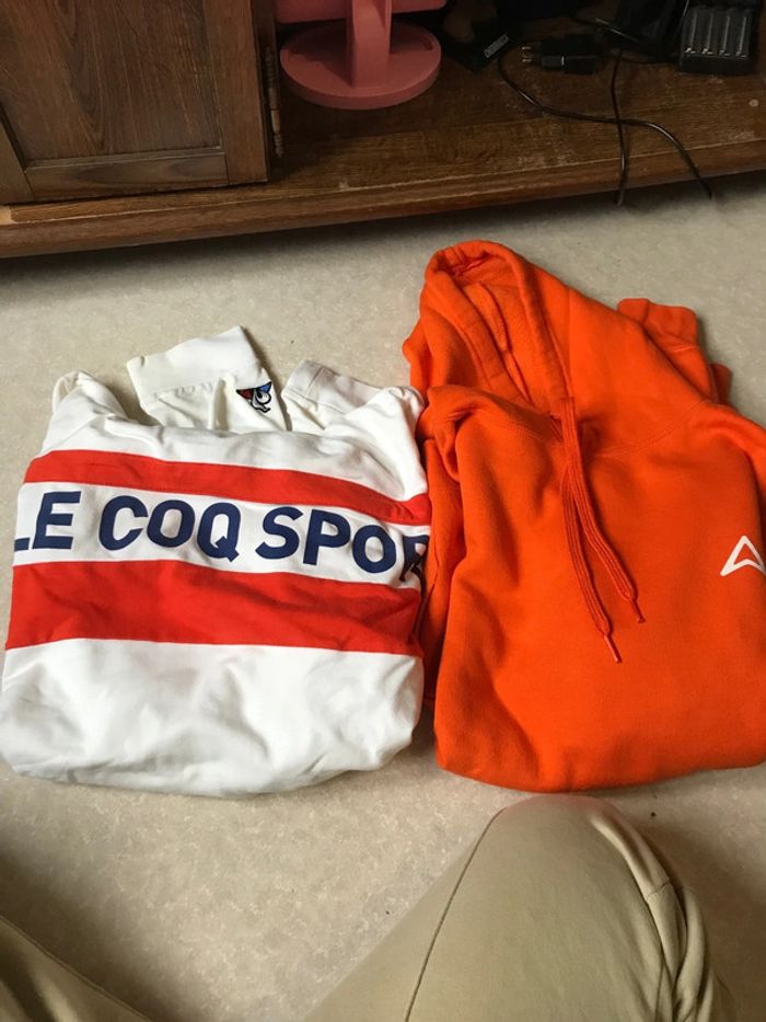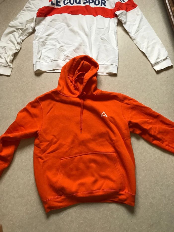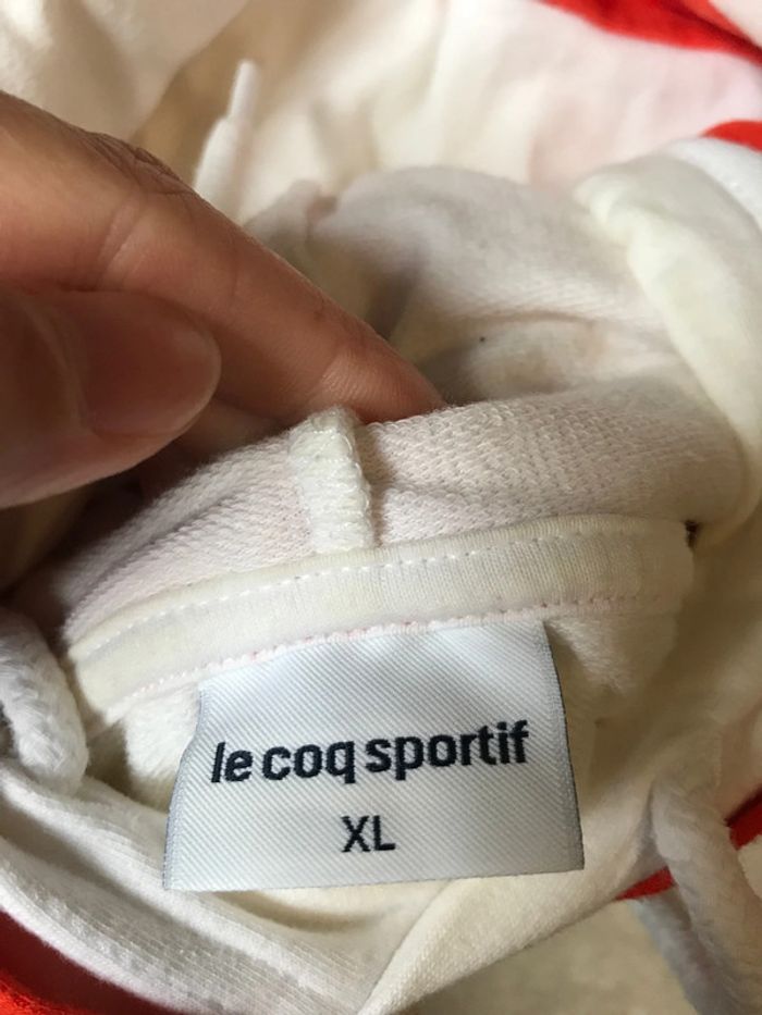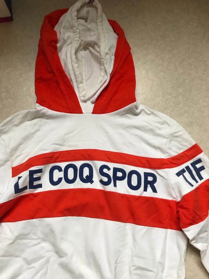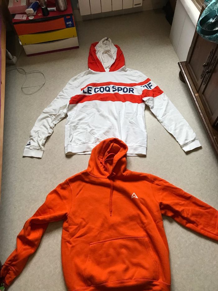 Le coq sportif orange et blanc et bleu avec double capuche en taille XL Le sweat orange avec capuche taille M et poche devant