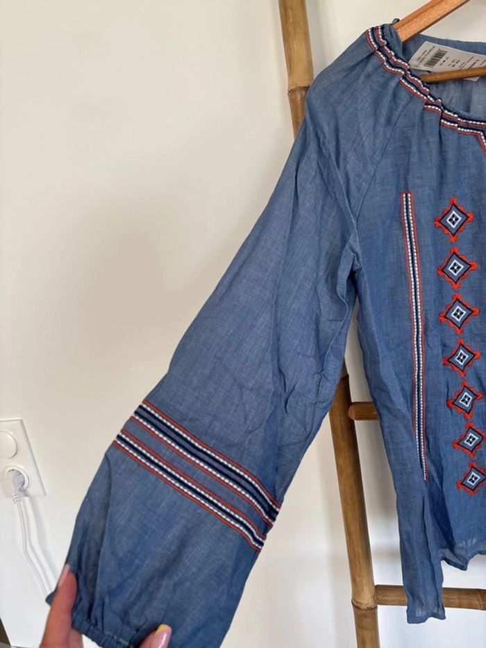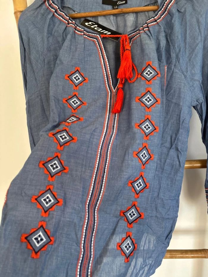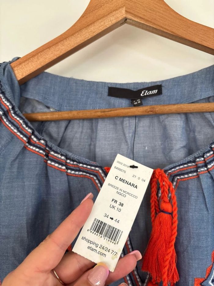 Blouse bleue et orange motifs brodes Neuve Etam Taille 38 Style bohème hippie