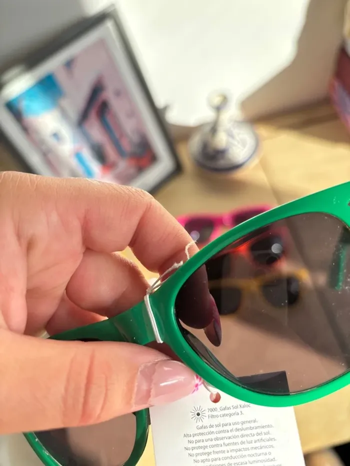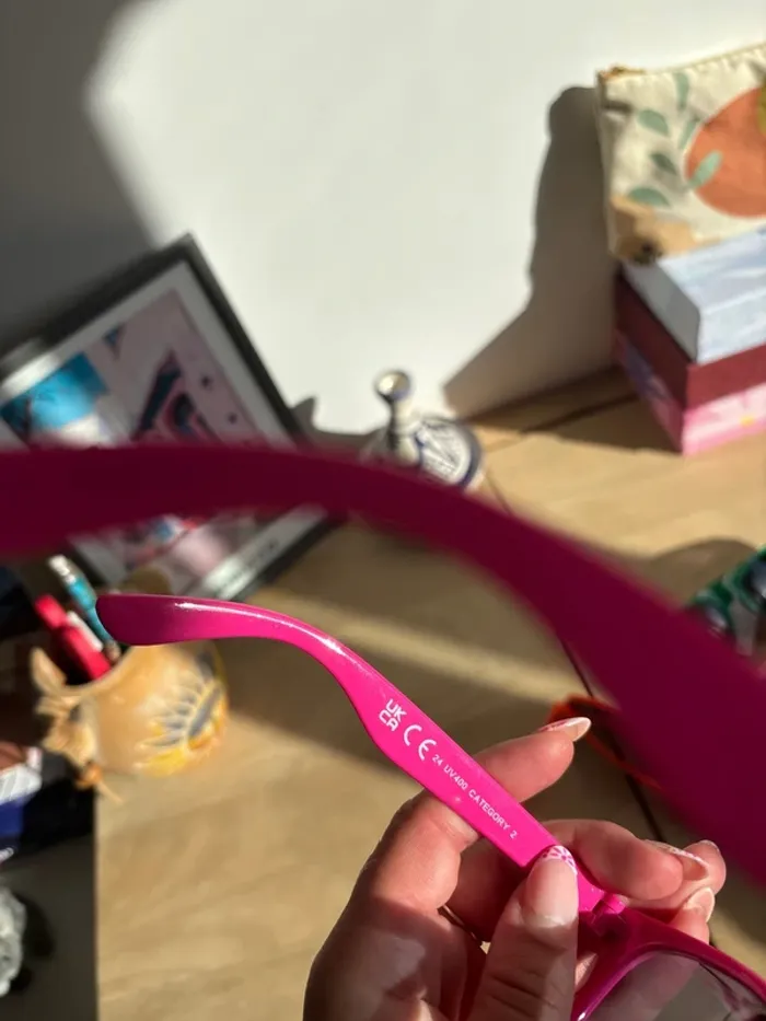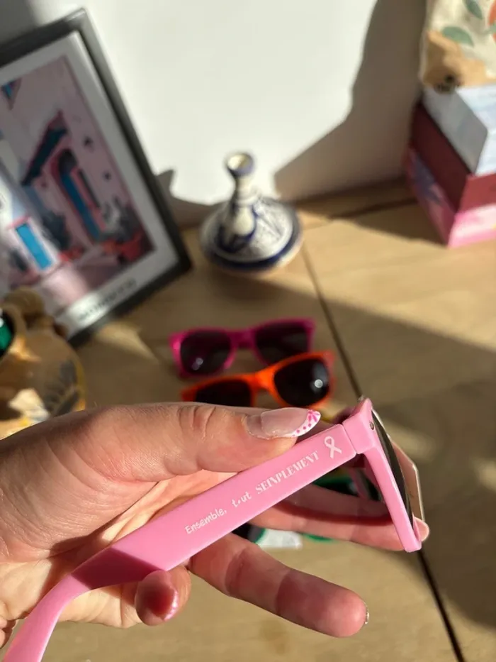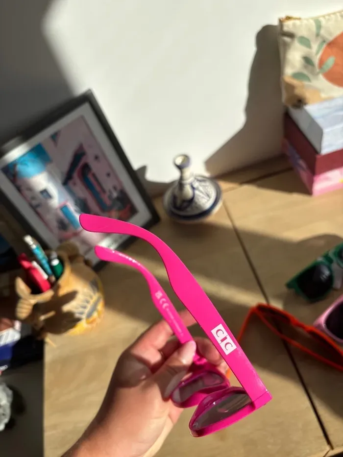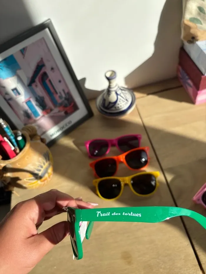 Lot de 5 paires de lunettes de soleil colorées - 1 paire verte « trail des tortues » neuve avec étiquette catégorie 3 - 1 paire rose pale « octobre rose » neuve avec étiquette catégorie 3 - 1 paire rose fushia « CIC » catégorie 2 - 1 paire jaune catégorie 3 - 1 paire orange catégorie 3 (peut-être un peu de poudre violet entre les verres et la monture car elles ont servi 1 fois pour une color run)