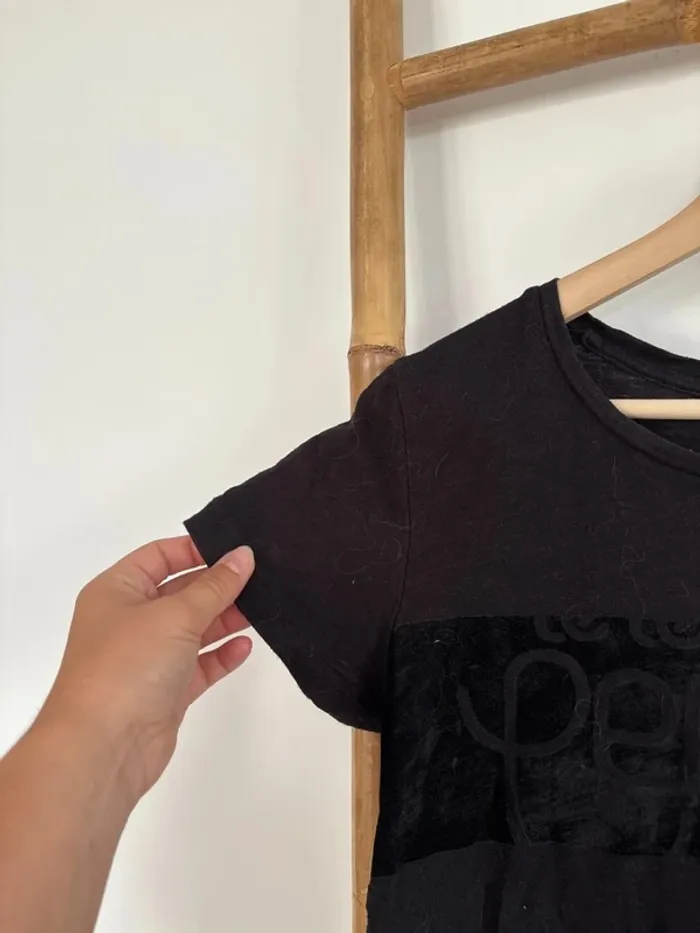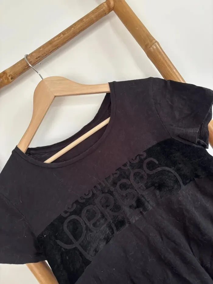 T-shirt noir Le temps des cerises Effet velours sur le devant Taille M En bon état T-shirt appartenant à une personne fumeuse, un 1er lavage a été effectué mais il faudra le relaver.