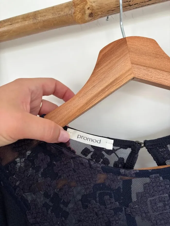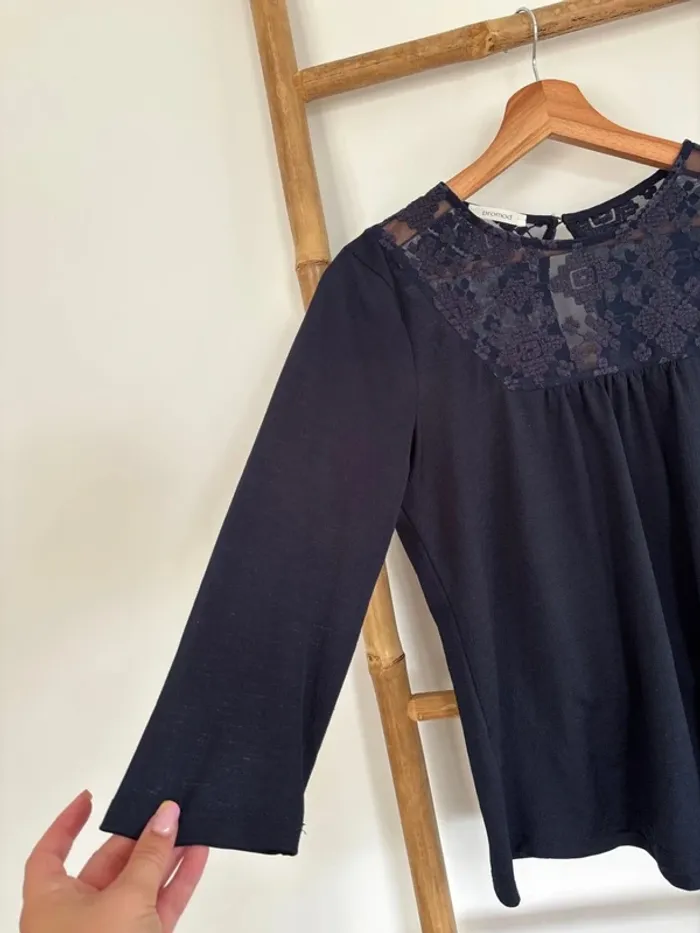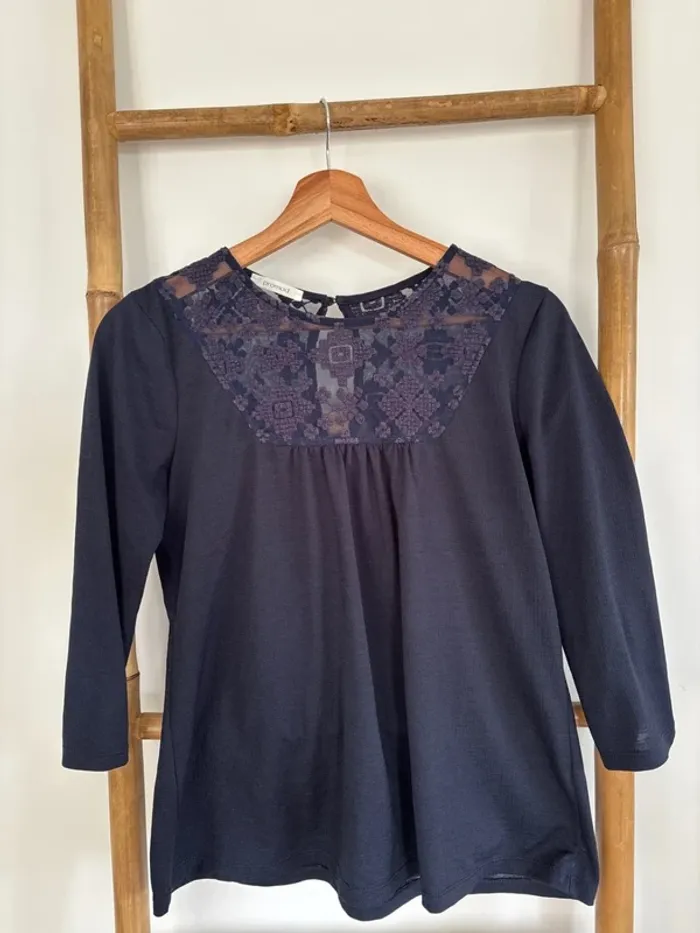 Jolie blouse bleue marine Manches 3/4 Détails en dentelle devant et derrière Petit bouton dans le dos pour fermer En excellent état Promod taille M