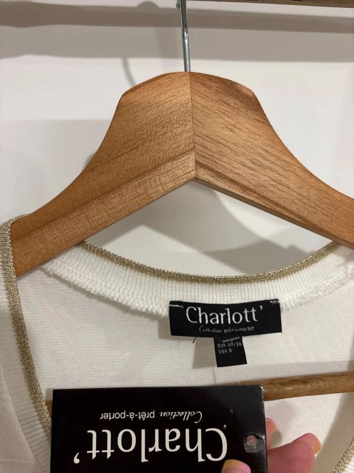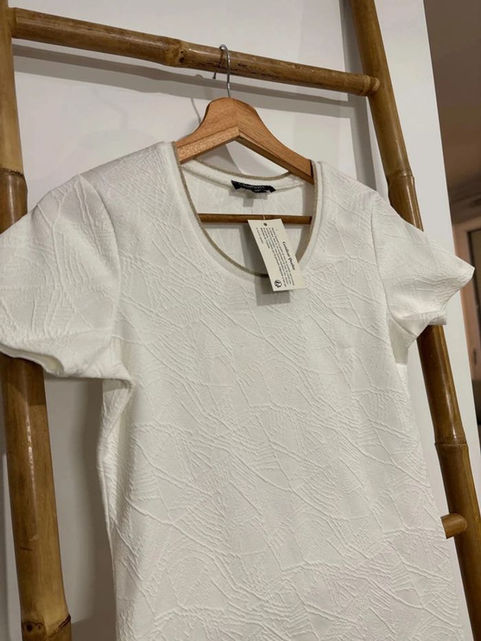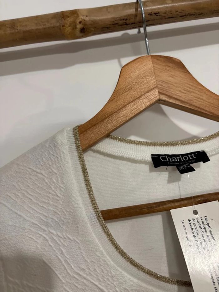 T shirt blanc texturé col avec liseret doré avec petite broche abeille neuf avec étiquette Charlott’ taille 34/36