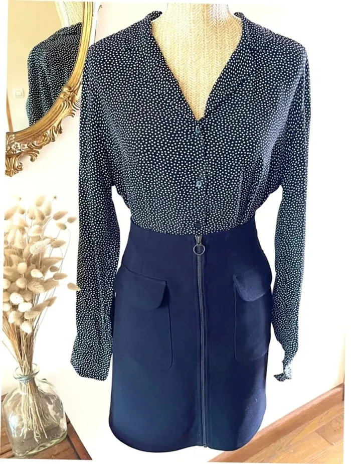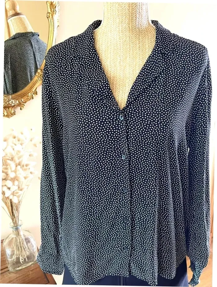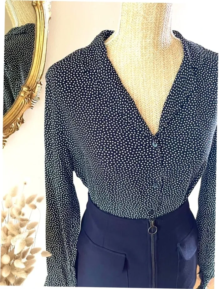 Sublime chemise manche longue à boutonnage et col noir et blanc style plumetis à pois taille L Camaïeu Pour un look parfait, n’hésitez pas à compléter la tenue avec la jupe encore disponible qui se trouve dans mon dressing!! 💡 Parfait avec un jean, un pantalon noir ou une jupe pour un look moderne. 🎁 Envoi rapide et soigné – Pense à regarder mes autres articles pour regrouper les frais de port !