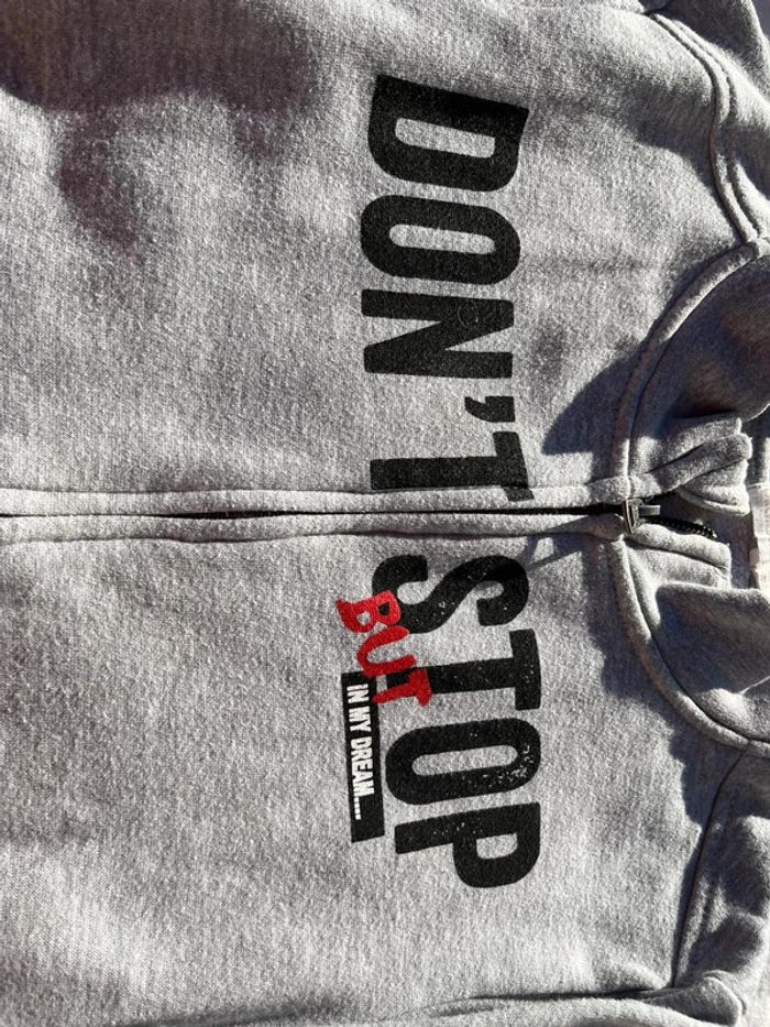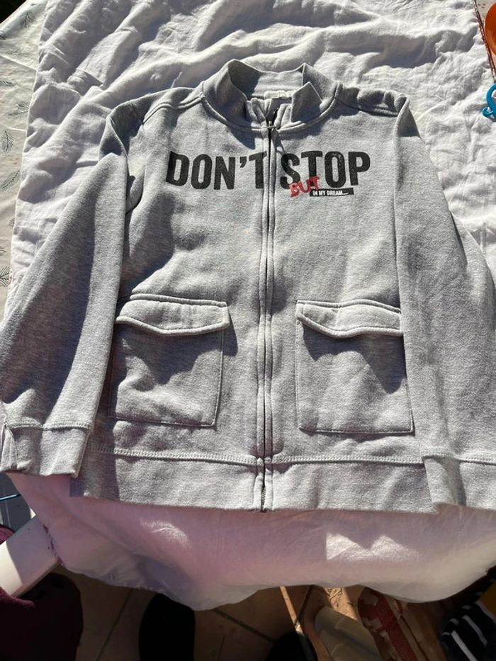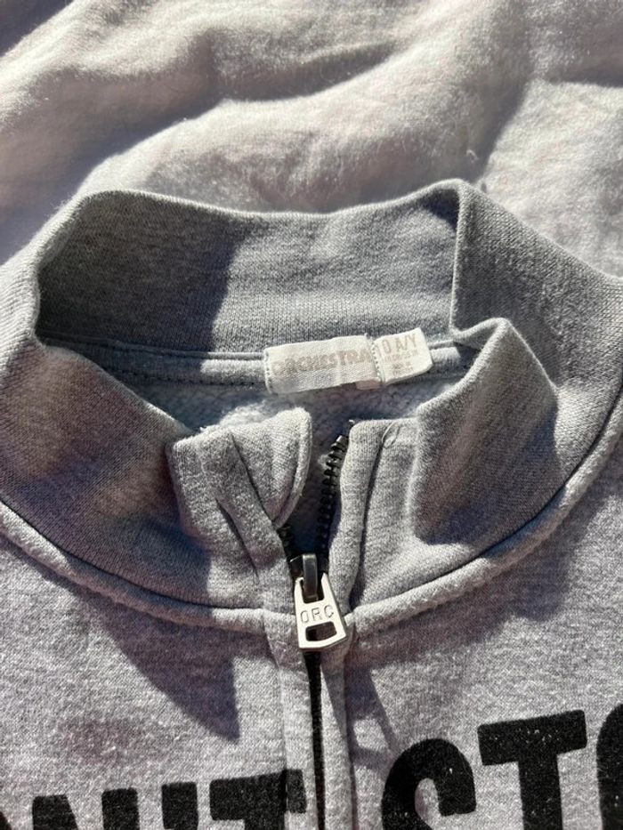 Gilet zippé gris Taille 10 ans Marque orchestra Voir le motif qui s’efface un peu sur le O du stop. #humana02_garçons_10ans