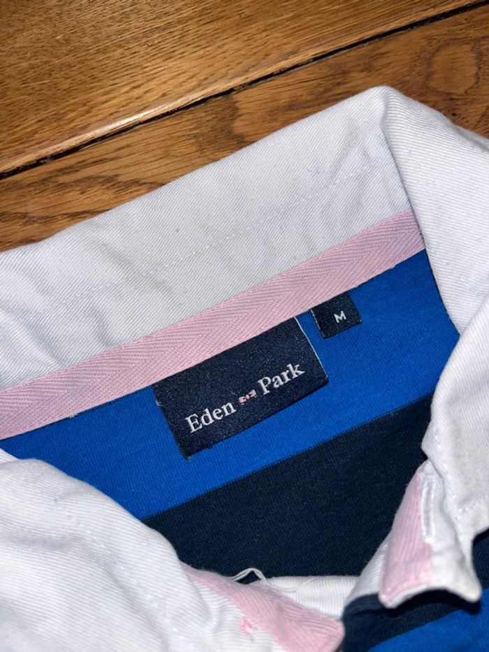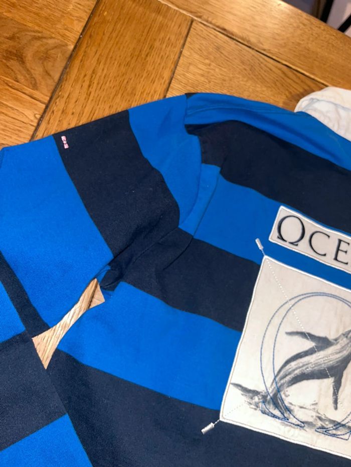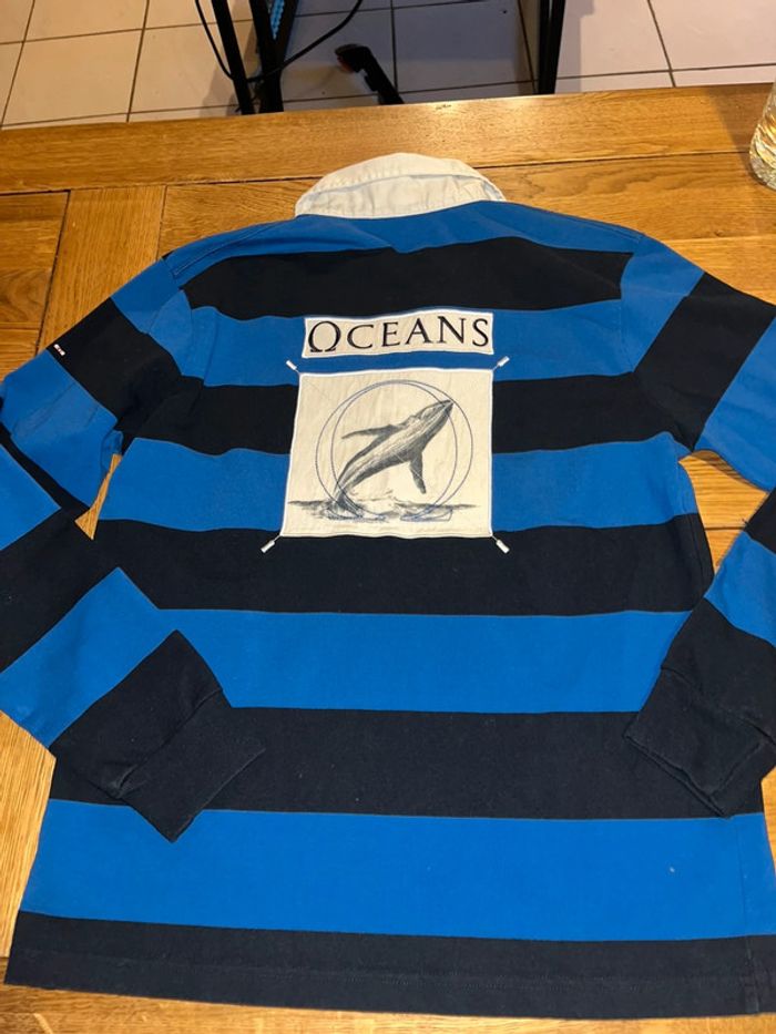Polo bleu à rayures motif baleine océan dans le dos en très bon état