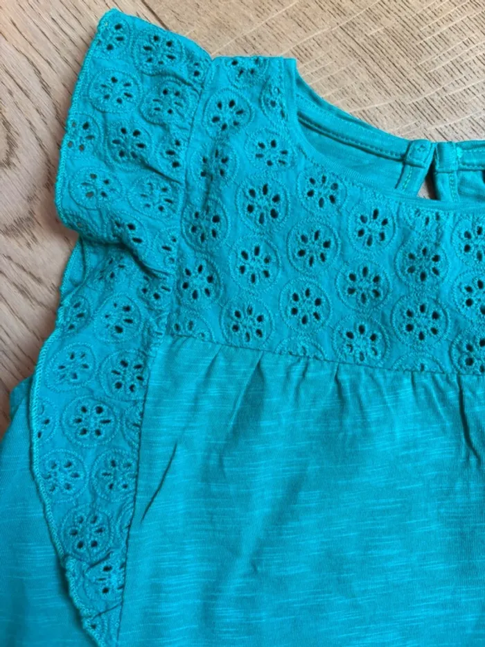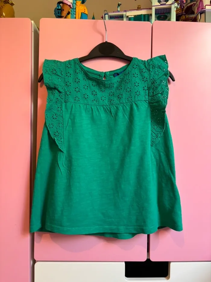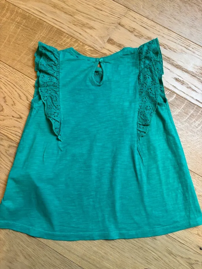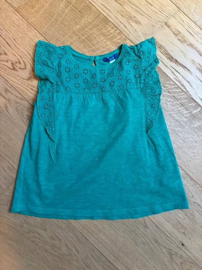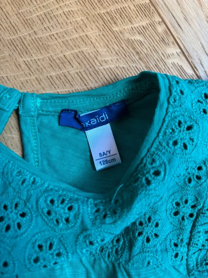 Porté 2 fois en très bon état T-shirt Okaïdi effet broderie anglaise Couleur vert Taille 8 ans Bouton forme goutte au dos
