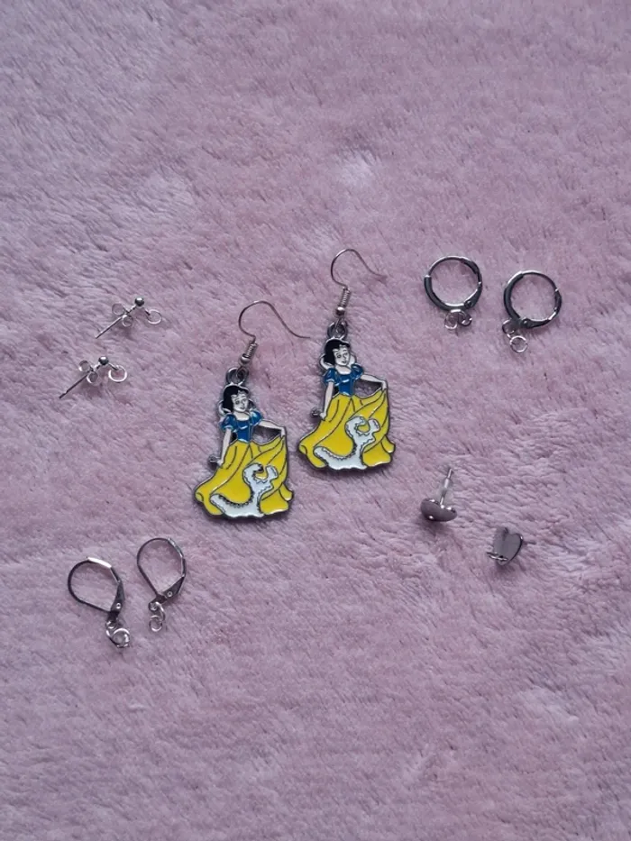 paire de boucles d'oreilles Blanche-Neige super mignonnes, avec attaches au choix ! 🔸 Détails : Boucles d'oreilles avec illustration de la princesse Blanche-Neige de Disney en jaune et bleu. Vous pouvez choisir l'attache parmi plusieurs options : Attaches classiques Attaches créoles Attaches dormeuses Attaches a clous boules ou cœurs 🌟 Caractéristiques : Légères et très jolies, parfaites pour ajouter une touche originale à votre look ! Convient à tous les styles : casual ou plus habillé. 📦 Envoi rapide et soigné. Si vous avez des questions ou besoin de plus de photos, n'hésitez pas à me contacter !