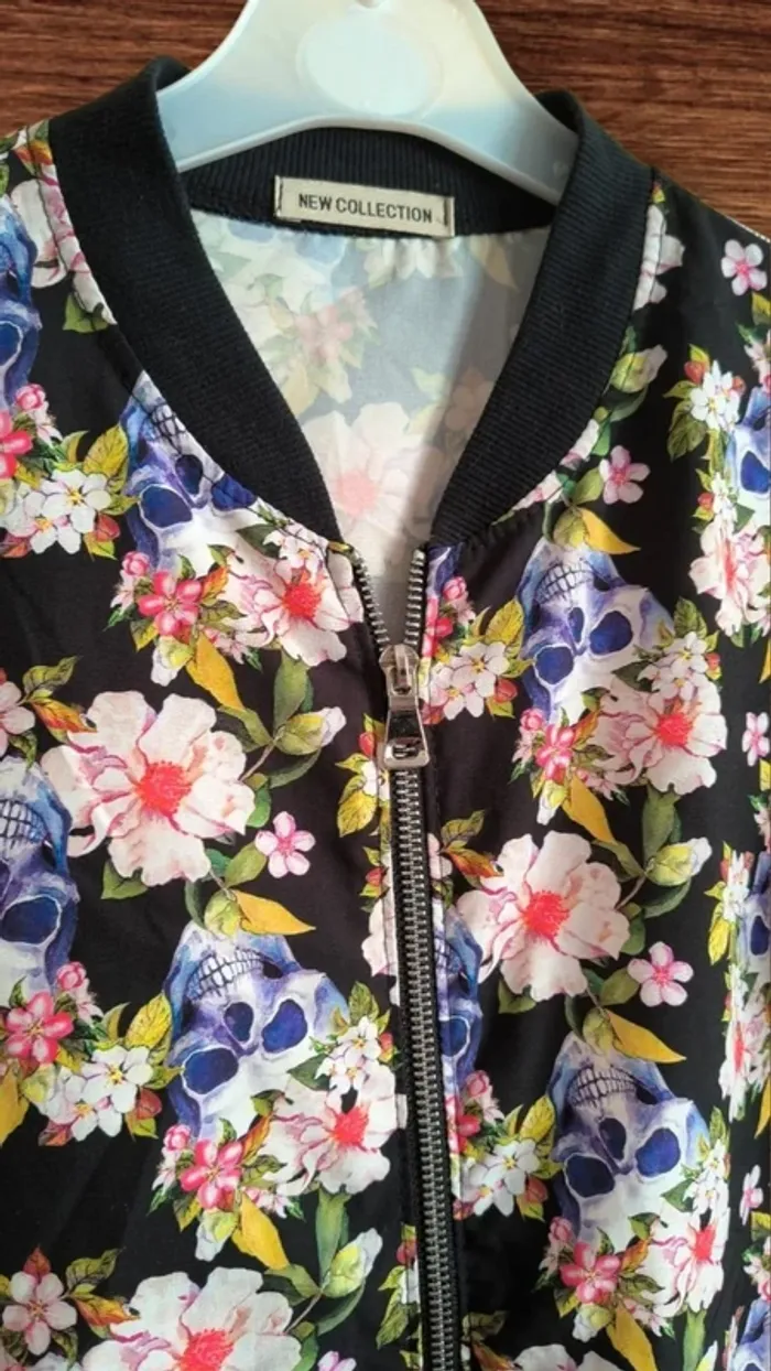 💀✨ Hyper stylée et unique : imprimé fleurs + têtes de mort violettes sur fond noir. Parfaite pour un look rock & romantique à la fois ! 🧥 Fermeture zippée, coupe confortable. 📏 Taille M 📸 État : Très bon état, portée une ou deux fois seulement. 🛍️ Marque : New Collection 🎯 Idéale pour les mi-saisons ou les soirées fraîches d'été. 💌 Envoi rapide et soigné. 💬 Dispo pour répondre à toutes tes questions !