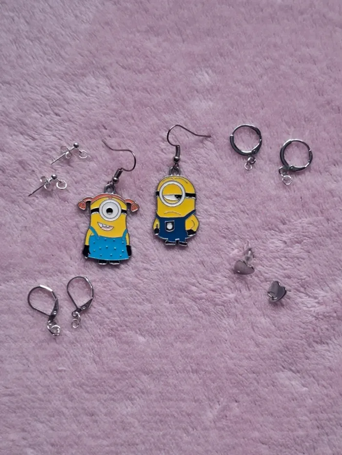 Paire de boucles d’oreilles Minions, fun et originales ! 👀 Modèle asymétrique (deux Minions différents) 🎨 Couleurs vives : jaune, bleu, noir ✨ Idéal pour les fans de "Moi, Moche et Méchant", pour un look décalé ou un cosplay 🔄 Fermoirs au choix : Crochet simple Dormeuse Clou classique 👉 Il suffit de me dire ce que vous préférez au moment de l’achat ! 📦 Très bon état, jamais portées 💌 Envoi rapide et soigné