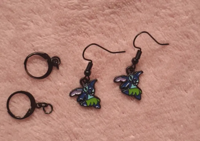 Paire de boucles d'oreilles représentant Stitch en jupe verte 🌿💙 Vous pouvez choisir le type d’attache : Crochet (actuellement monté) Anneau (photo en bas à gauche) ✨ Attaches noires pour un style discret et original 📦 Envoi rapide et soigné 💌 N'hésitez pas à me contacter pour toute question !