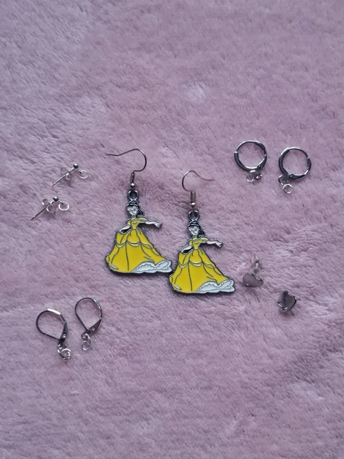 ✨ Boucles d’oreilles Disney - Belle (La Belle et la Bête) ✨ Paire de boucles d’oreilles représentant la princesse Belle dans sa robe jaune. Super légères et originales – parfaites pour les fans de Disney, cosplay ou pour une touche fun au quotidien 🟡👸 ➡️ À la vente : ✔ 1 paire de boucles d’oreilles Belle ✔ + 1 paire d’attaches au choix parmi les 5 modèles visibles sur la photo : – crochets (déjà montés), – clous – dormeuses, – créoles, – Clous coeur 🧷 Matériaux : métal léger, attaches en acier inoxydable 📦 État : Neuf, jamais portées 🖐️ Personnalisable selon tes préférences d’attaches !