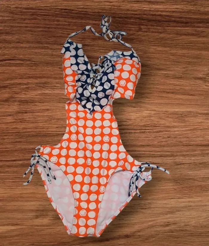 Maillot de bain 1 pièce ultra original avec imprimé pois blanc sur fond orange et détails bleu Décolleté plongeant avec volants et lien à nouer au cou et au dos 💃 Découpes sur les côtés pour une coupe flatteuse et féminine ✨ 📸 Voir photos portées + à plat (devant / dos) 📏 Taille : S-M 📦 État : Très bon état, jamais porté 🧵 Détails : Lien à nouer au cou et dans le dos Volants décoratifs Culotte à nouer sur les côtés Doublé, confortable et stylé 🧡 Idéal pour un look pin-up / rétro à la plage ou à la piscine ! 🎁 Envoi rapide et soigné 📬 Dispo pour répondre à vos questions !