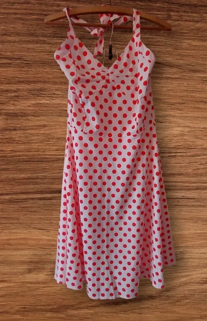Jolie robe blanche à pois rouges, au style rétro et féminin 🎀 Décolleté en cœur, bretelles larges à nouer à la nusmque coupe flatteuse cintrée à la taille et jupe évasée. À l’arrière, un laçage noir décoratif apporte une belle touche d’originalité. La robe s’enfile simplement (pas de fermeture). 📏 Taille : M 📐 Coupe : Cintrée sur le buste, évasée à partir de la taille 🎨 Couleurs : Blanc avec pois rouges vifs 📦 État : Très bon état / comme neuve 🌞 Idéale pour : l’été, un pique-nique, une soirée à thème rétro, ou simplement une tenue fun et légère