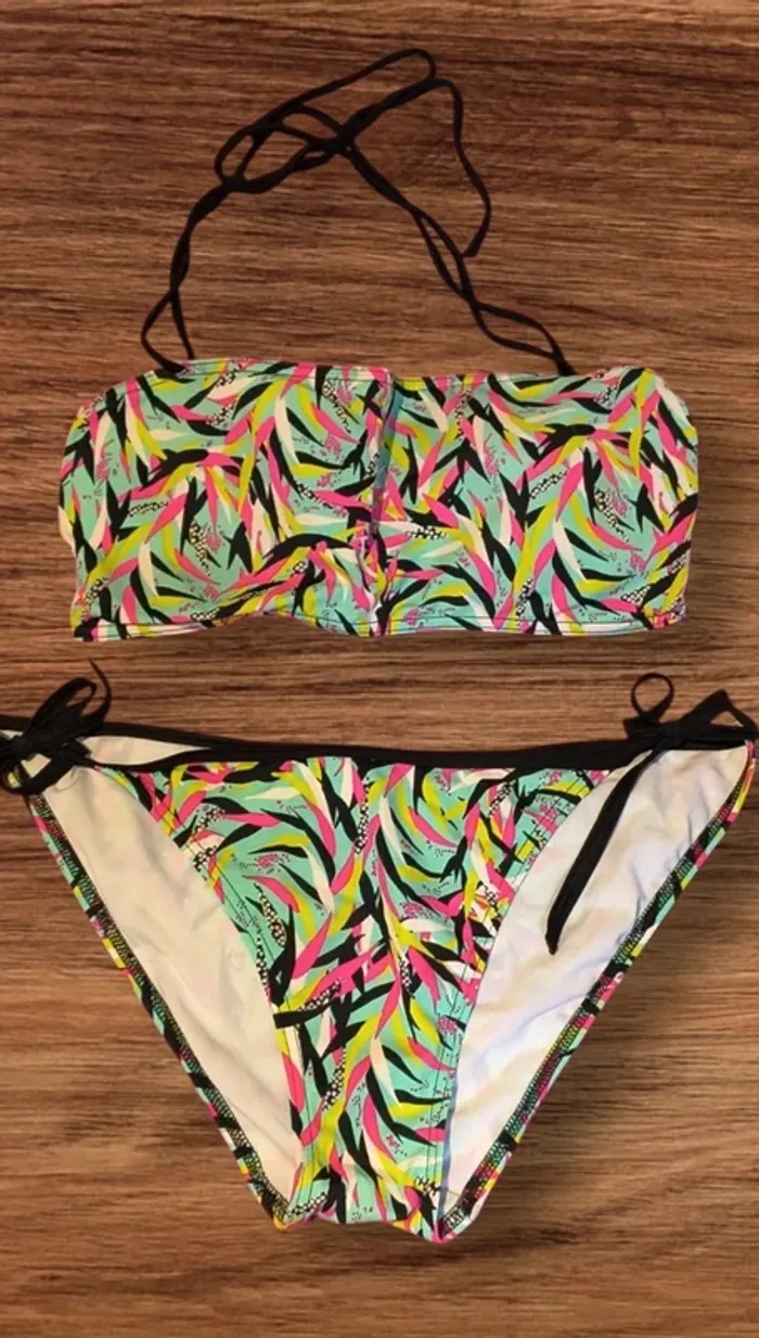 Envie de briller à la plage ou à la piscine ? 🏖️ Ce maillot de bain ultra vitaminé est fait pour toi ! 💃 Motifs tropicaux flashy – rose, vert, jaune, noir : impossible de passer inaperçue ! 🎀 Haut bandeau avec bretelles amovibles + bas à nouer sur les côtés 🧼 Très bon état – porté une seule fois 📏 Taille L environ (convient aussi à un M si ajusté grâce aux liens) 💌 Envoi rapide et soigné 📦 💸 Prix tout doux