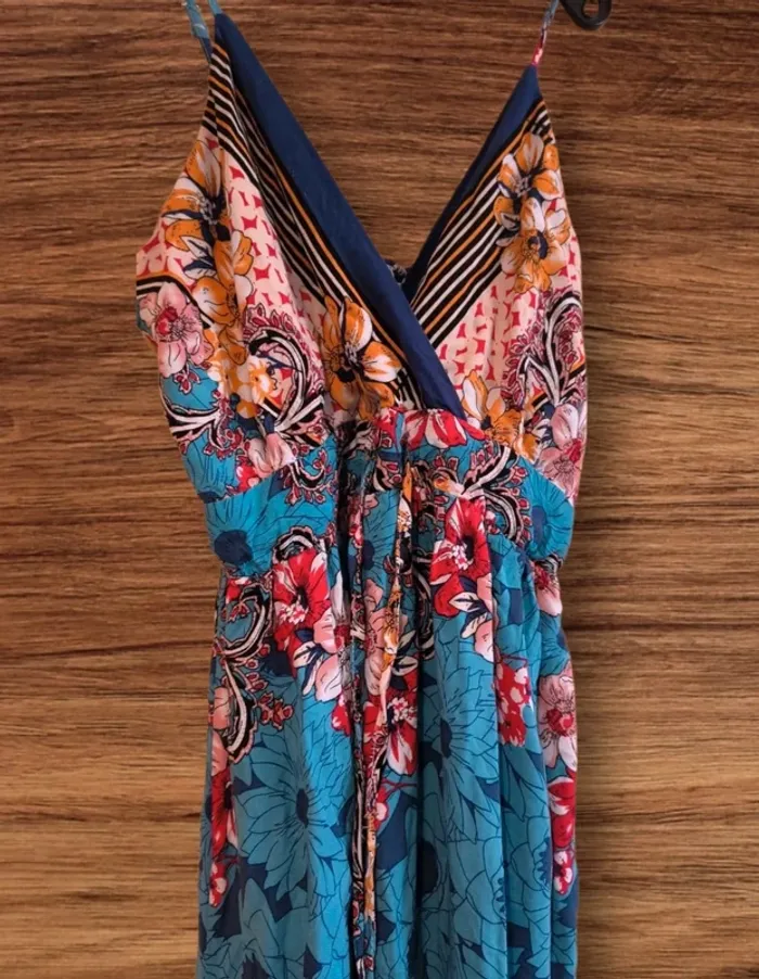 🎨 Couleurs : mélange de bleu, rouge, jaune & motifs floraux
