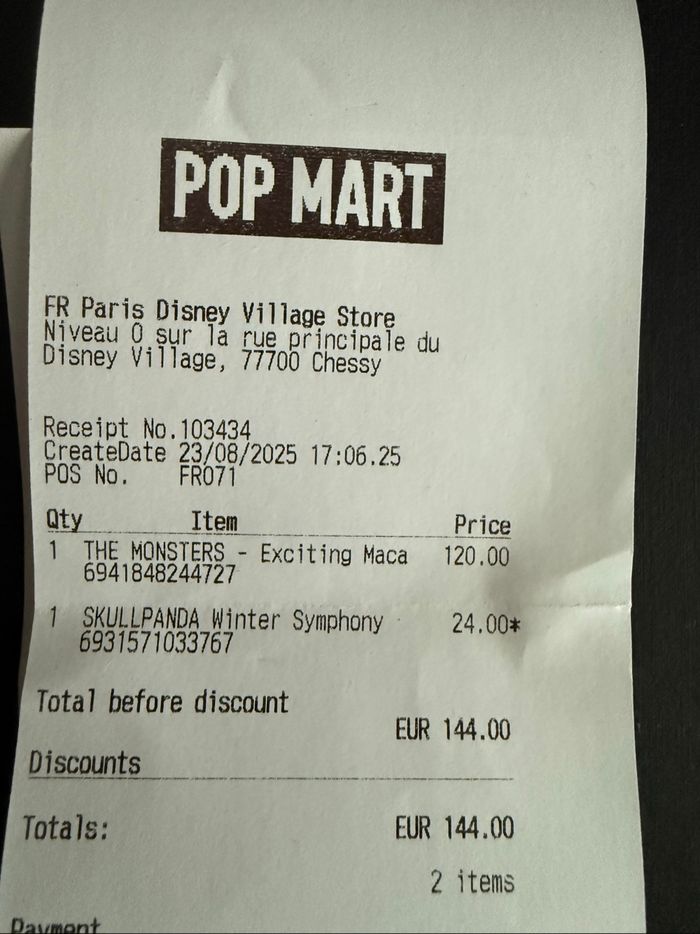 Labubu acheté le 23/08/2025 en boutique officiel POPMART.
