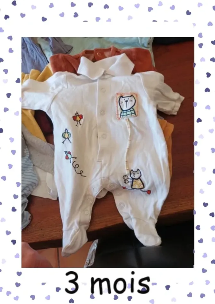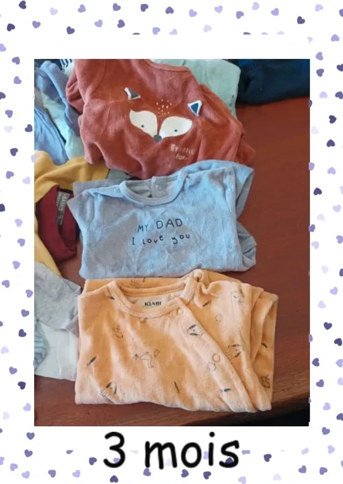 Lot en 3 mois comprenant 6 pyjama en velours, 7 tee-shirt manches longues dont un diesel, un sweat tape a l oeil, 3 survêt molleton, 1 legging Zara, une salopette sans manche bleu polaire, deux gilet en coton ( rouge et bleu) et un trench, un pyjama coton en 1 mois #audreyg133903mois