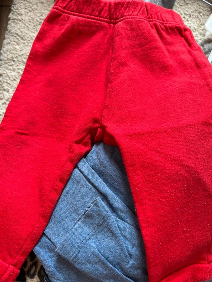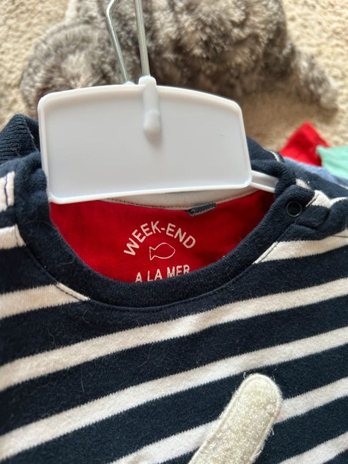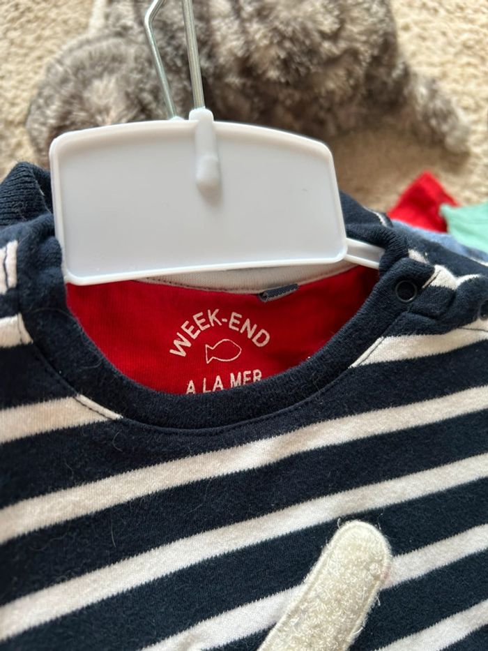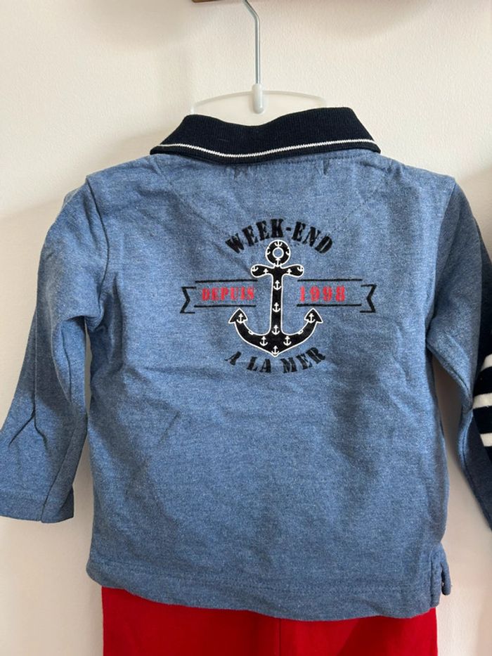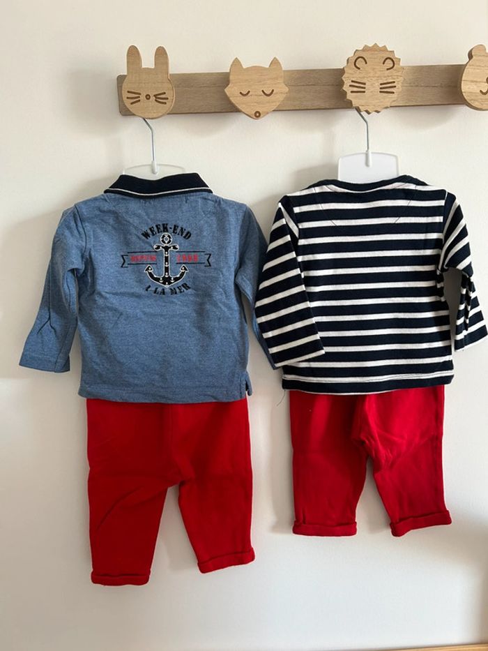 Lot de 2 ensembles de la marque « week end à la mer » sauf 1 des pantalon rouge qui est de la marque Kiabi (bouloches visibles sur la dernière photo). Tout en très bon état sauf le pantalon Kiabi #bebe12moisgarcon #bebe12mois