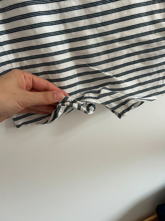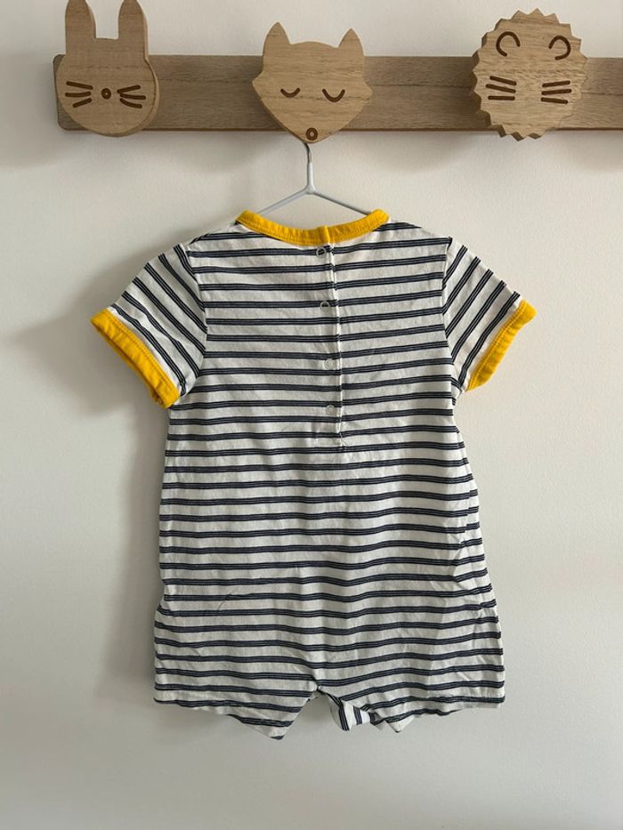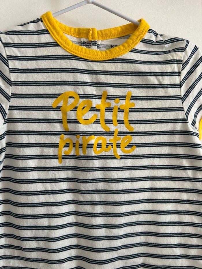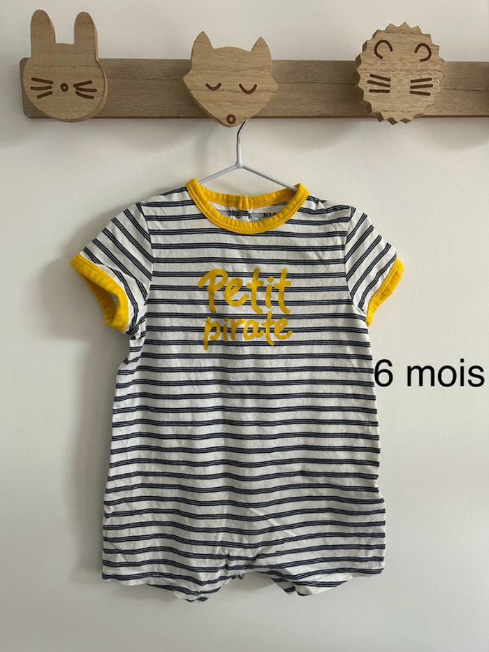 Jolie barboteuse d été « petit pirate» blanc rayée bleue marine et écriture jaune Ouverture entre les jambes. #barboteusebebegarcon6mois #bebegarcon6mois