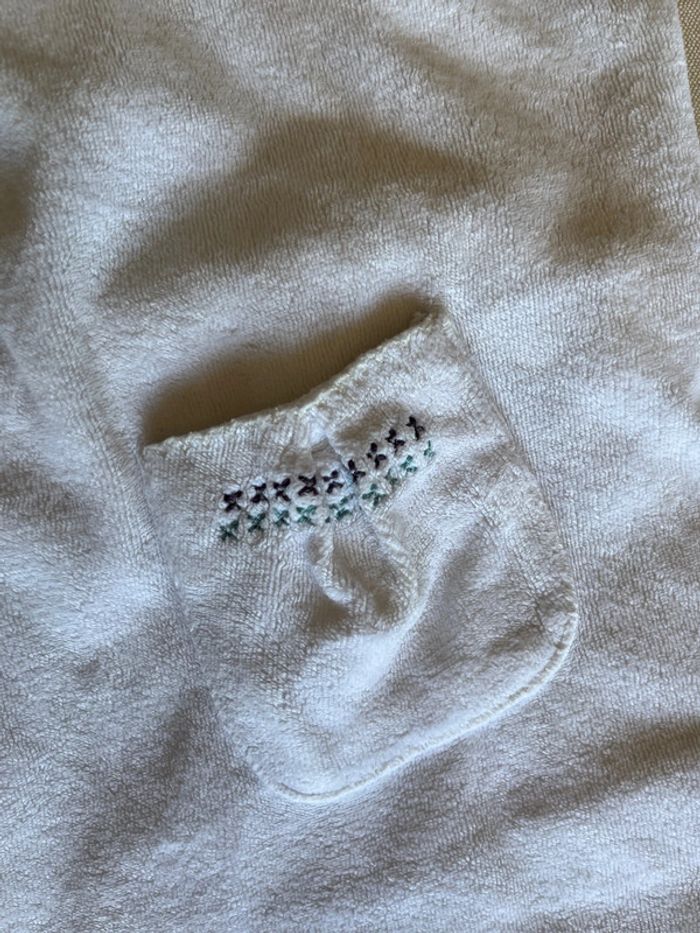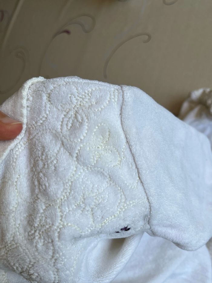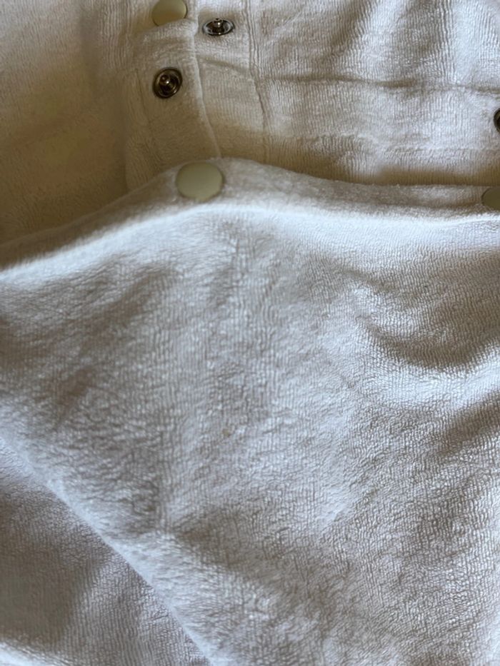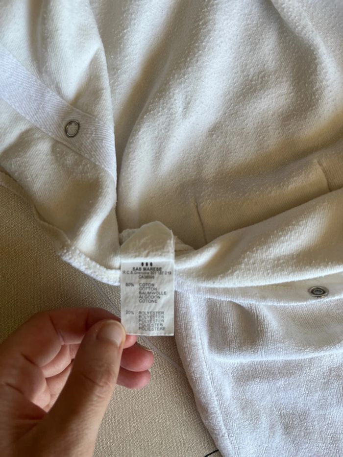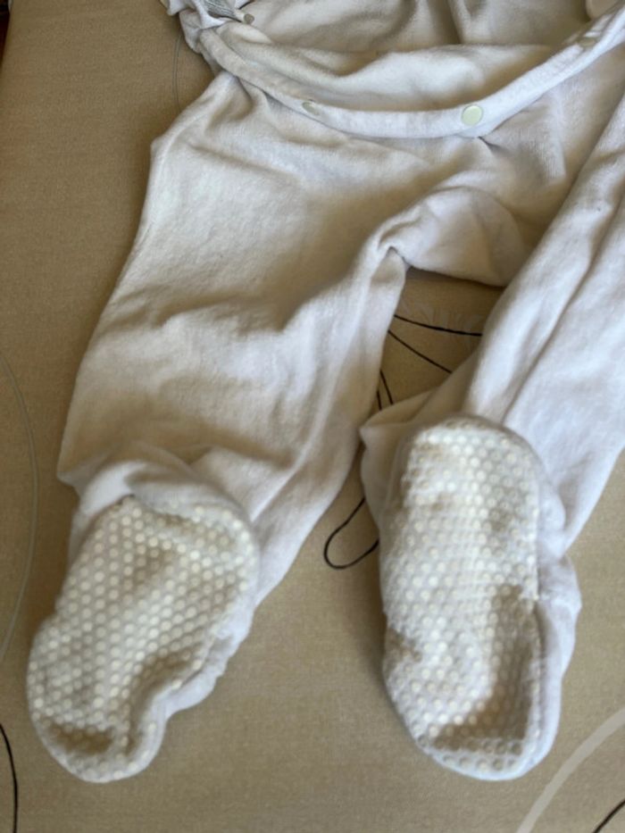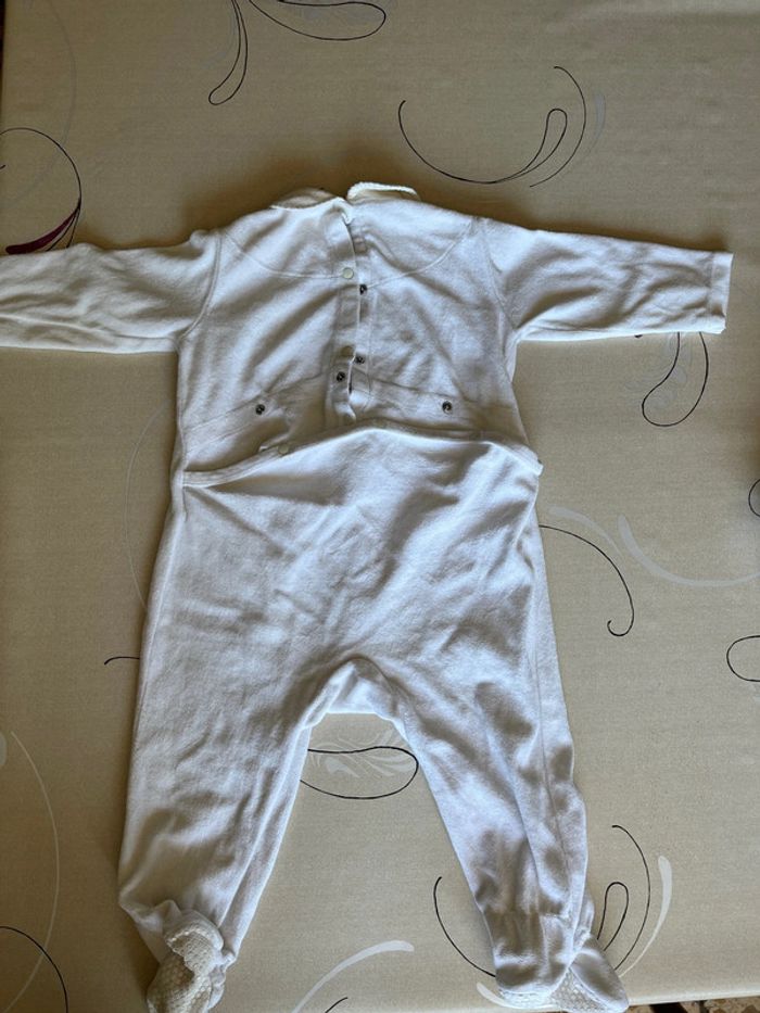 Très bon état général mais il y a deux taches peu visibles (en haut au niveau de l’épaule gauche et derrière au niveau des fesses - voir photos) Pieds antidérapants 18 mois - 81 cm Couleur blanc cassé