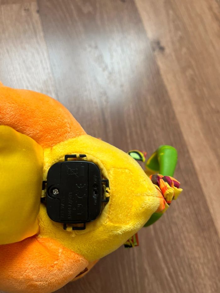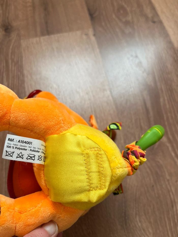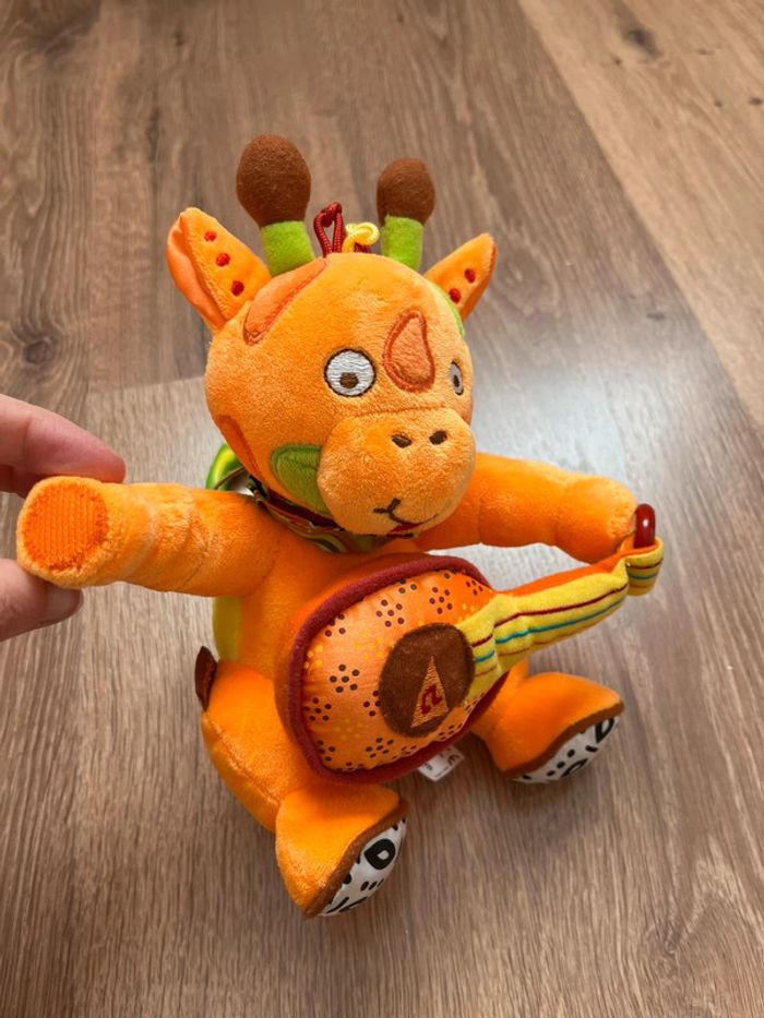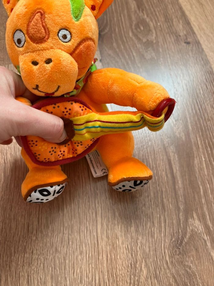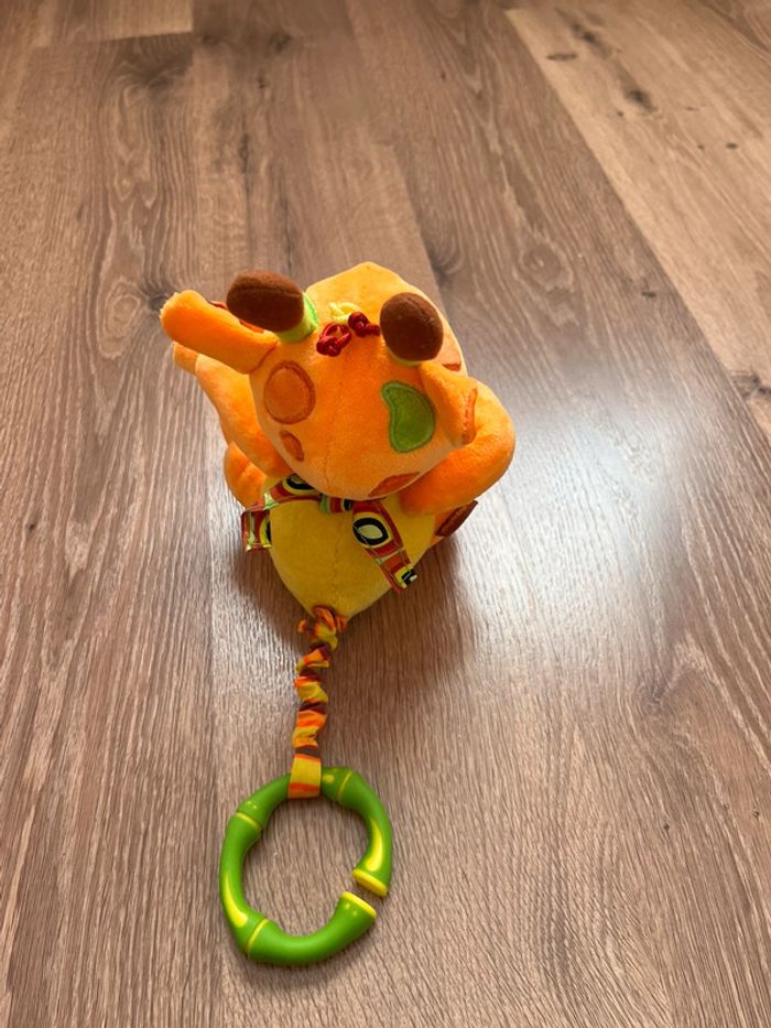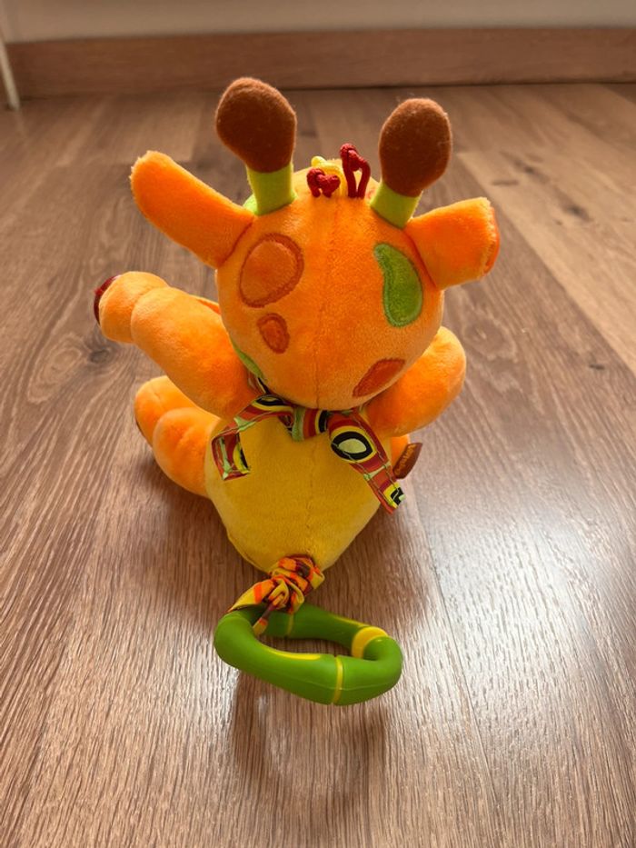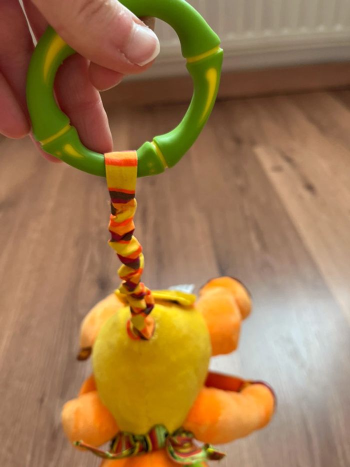 Très bon état, peu servi. En appuyant sur la guitare, cela fait une petite mélodie et on peut tirer sur la queue qui se rétracte ensuite en vibrant. Anneau qui permet de l’accrocher à une poussette, un parc ou au lit #jouets_bebe_helenyan